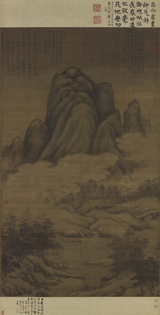 〈春山晴雨〉(圖1)畫面以濕潤的筆觸描繪溪澗景致,構圖層次井然,筆墨細膩。近景繪坡石叢樹,以墨點染添葉;中景雲霧縈繞,用墨線略作勾勒;遠景山巒層疊聳立,並施以橫向苔點,具米氏雲山遺韻,並以淡墨加以暈染天際,營造煙嵐縹緲之雨日氛圍。全幅青綠設色古樸典雅,使畫面更顯盎然生機。畫幅上無畫家落款,唯有署名息齋道人(李衎,1245-1320)之題識述及此作為彥敬(高克恭,1248-1310)所繪贈,或可依此一探高克恭與李衎之往來交遊。
