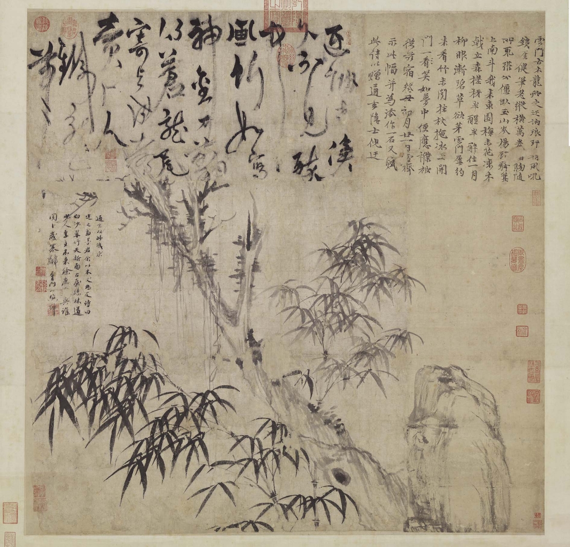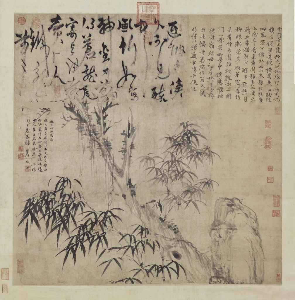 元代合作畫之珍品〈古木竹石〉(圖3),集結顧安(約1289-1365後)、張紳(約活動於14世紀後期)、倪瓚(1301-1374)三位畫家的筆墨,以及楊維禎(1296-1370)的題詠,展現了文人群體的創作互動與藝術對話。