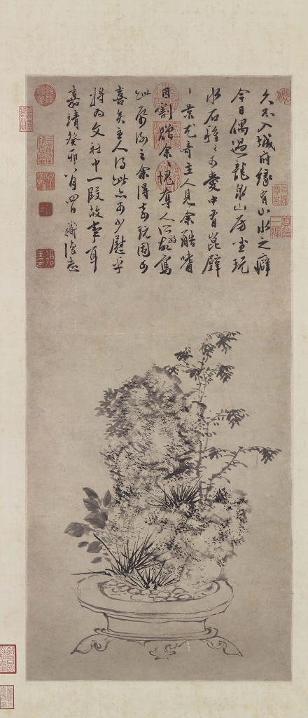 明代陳淳(1483-1544)所繪的〈崑璧圖〉(圖4),則為答謝友人的回禮。陳淳,字道復,又字復甫,號白陽山人,是位博學多才的文人,不僅通曉經學、詩文與書法,在繪畫上更有獨到造詣,尤精於寫意花卉。嘉靖二十二年(1543),陳淳因文社友人贈送一座崑山石盆景,遂以此為題,創作〈崑璧圖〉。崑山石產於崑山市馬鞍山(又稱玉峰山)一帶,因質地潔白、洞孔玲瓏,深受文人喜愛,為案頭陳設與雅集賞玩之佳石。宋代杜綰《雲林石譜》已有記載此珍貴白石,明代林有麟《素園石譜》亦著錄崑山石屬火石,火氣溫暖,故栽植菖蒲等草木尤為茂盛,歷來備受文人品賞。畫中崑山石以焦墨點苔,筆法率意而不失韻致,盡顯石質玲瓏剔透之巧。石旁與石上皆綴以細長草葉,或即菖蒲。盆器形制撇口折沿,淺壁且附三足,輪廓以流暢細勁的筆觸勾勒,展現畫家以書入畫的筆墨功力。作品簡練中見精微,崑山石、植栽、盆座等各物象的質感與結構,無不精準掌握。上方陳淳以草書自題:「主人見余酷嗜,因割贈余。余愧奪人所好,故寫此紙謝之。余得奇玩,固可喜矣。主人得此,亦可少慰乎。」文詞流露對友人慷慨贈石的深厚感謝,正因如此,特意繪製此圖回贈,以筆墨寄託謝意。