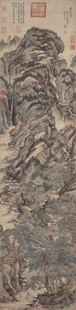 此作構圖繁密,山勢連綿起伏,崖壁陡峭,飛瀑直瀉,營造清幽靜謐之境。山體以細緻且具律動感的線條刻畫質理,筆法深受元代畫家王蒙(1308-1385)影響。畫家運用細長直幅與景物層疊的布局,引導視線沿山徑蜿蜒深入。屋宇依山勢錯落,掩映於蒼翠林木間,宅院內簾幕低垂,案上陳設雅物,營造出文人居所的幽逸氣息。前景中,一位文士策杖前行,身後童子捧卷相隨,應是象徵謝安之形象。畫中亦點綴閒適人物,有的垂釣於舟,有的靜坐遠望,整體流露出「東山之志」寄興山林之風雅情懷。