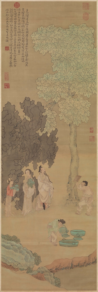 此作品畫園林一隅,一位文士正目視著刷洗梧桐樹的過程,其與旁側兩位仕女的立足之處,與洗桐者及前方俯身倒水者相對應,形成穩定的三角構圖,使場景更具層次感與視覺張力。畫家筆下人物各具神態,姿勢生動,設色清雅,湖石與梧桐葉以帶有裝飾性的圖案化風格描繪,別有新意。此畫被後世認為是洗桐題材的傳世範本,明清時期的畫家或引借此倪瓚形象的洗桐場景,或以時人為主角繪贈畫作,以表達對友人品格的推崇與敬仰,文人亦常於畫上題贈詩文,藉以讚揚收受者之節操。