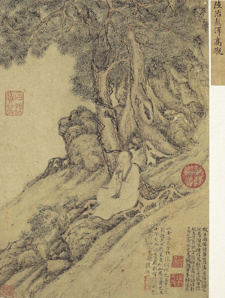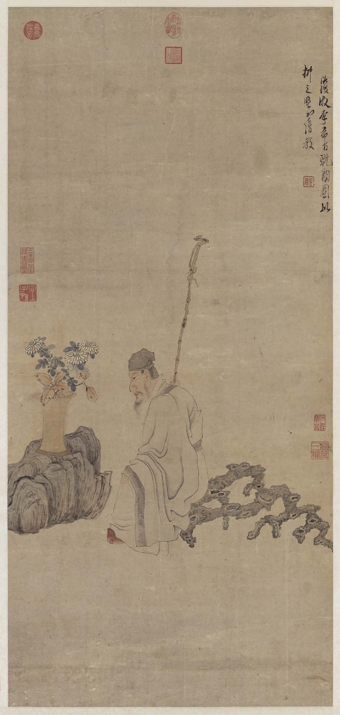 陶淵明以其高潔的品格與悠然自適的精神態度,長久以來受到後世文人的景仰。在書畫贈答中,其形象與典故亦屢見不鮮,成為寄託志趣與讚頌友人的常見題材。〈彭澤高蹤〉(圖7)便是描繪此形象之例子,其畫名源自陶淵明曾任彭澤縣令之典故。畫中文人倚松而坐,神情閒適,手持菊花,呈現「採菊東籬下」之雅興。右下方題識則敘述了一段贈菊回禮的故事。嘉靖二年(1523),陸治(1496-1576)的友人知其愛菊,特贈秋菊以供清賞,陸治則繪此作以表答謝。作品雖繪陶淵明形象,或畫家藉此自喻。約五十年後(1572),陸治隱居支硎山,友人攜此畫過訪,畫家再次為其題寫,顯見深厚情誼。