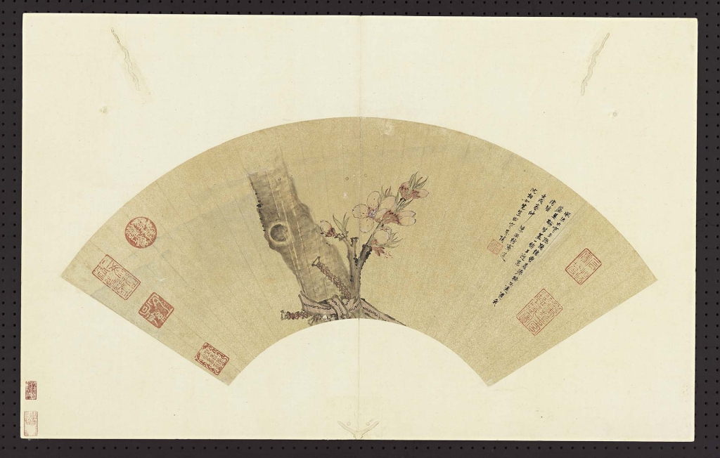 另一件也是陳洪綬所繪的〈著色桃花〉(圖9),作於天啟二年(1622),畫中桃花枝繫於樹幹上,上方隱沒於雲霧間。作品用筆細緻,設色清雅,樹之蒼勁襯托花之嬌柔,為布局配置之巧思。從題識可知,作品是為即將前往武陵任官的友人而作,取材自陶淵明(約365-427)〈桃花源記〉典故,末句又另引蘇軾〈芙蓉城〉詩序中王迥與仙人周瑤英共遊芙蓉城的傳說,使畫作增添了文人雅士所熟悉的文學意趣。