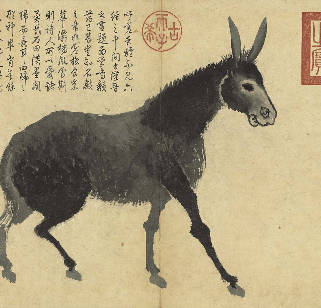 特別指出「粗筆淡瀋,一揮而就,而生氣奕奕如睹」,最後一開的驢子則強調蹄腕都一筆畫出,起收運筆痕跡都清清楚楚,用筆相當精絕。這些原始無修飾的筆觸,就跟書法中的點畫一樣,觀者可 以透過動作連結到畫家手部的肌肉,進而一路窺探其內心深處。