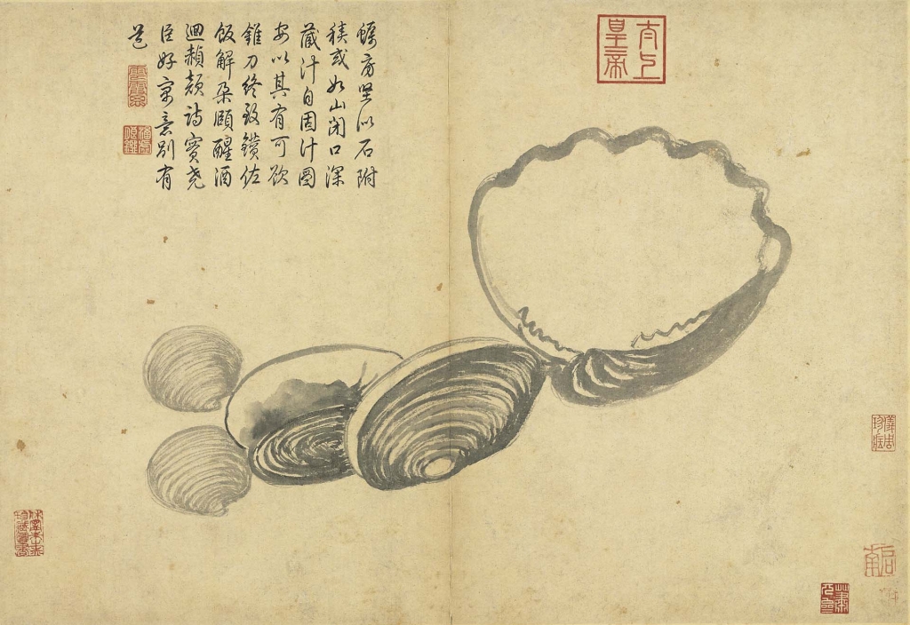 最大的殼擺放的角度,顯示以一種俯視的方式觀察,而且就在距離視野非常近的餐桌上。空殼顯示裡面的肉已經吃完,左邊有一顆還能見到肉的,顯示尚未食用完畢,整個場景其實是暗示還處在享用的過程中。想像力豐富些的觀者,搞不好還能遙想老先生當年咀嚼的動作,搭配自己的實際美食經驗,隨著沈周生動筆觸帶動刺激下,或許不知不覺中還會嚥下幾口口水。