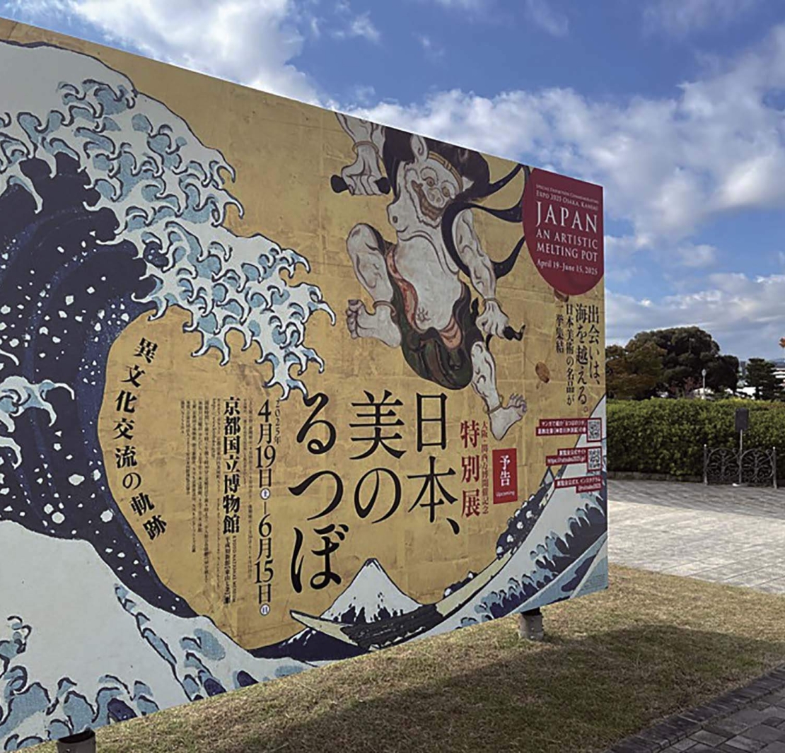 在2025年4月開始的關西地區盛會中,京都國立博物館(圖7)也沒有缺席。京博推出的是「日本、美のるつぼ―異文化交流の軌跡ー(中譯:日本,美之熔爐─跨文化交流的軌跡)」(圖8)。るつぼ,意指熔爐,是策展單位為了強調作品體現的異文化交流而選出的具體意象。依筆者的觀察,作品主要分為兩大類。一類是特別受到世界其他地區,尤其是歐美,歡迎的日本作品,包括浮世繪、琳派屏風等。葛飾北齋《富嶽三十六景》(圖9,展覽文章請見《典藏.古美術》391期頁26)知名度之高,自然不用多說,琳派作品也是自19世紀起就受到歐美鑑賞圈的推崇。策展者似乎抱有「外行看熱鬧,內行看門道」的企圖,除了吸睛的美術作品之外,也展出了數種19世紀後期至20世紀初期出版的書籍,提醒專業觀者,美術史建構的過程。