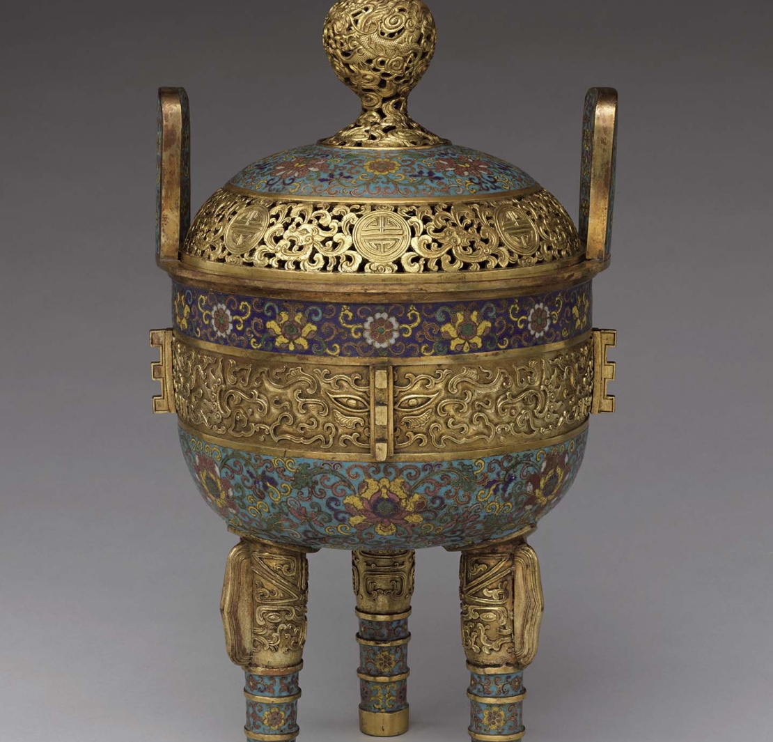 自古以來的禮樂演奏中,銅鐘與玉磬是必不可少的器具,乾隆皇帝亦曾為了朝廷祭壇和宮殿而訂定編鐘。完成於乾隆十年(1745)的〈銅鎏金「南呂」編鐘〉(圖18),其特點是鏤空吊冠和幾何圖案,這在過往的編鐘形制裡是史無前例的。另一件同屬乾隆朝的〈掐絲琺瑯仿古銅香鼎〉(圖19),則可見識到皇帝對於復古的強烈興趣,進而影響宮廷的工藝設計。此爐外觀仿照古銅鼎,掐絲琺瑯製成的五彩纏枝花卉紋,在中央鎏金浮雕飾帶的襯托下更顯出色。另外浮雕上的圖案靈感,則是來自高古銅器上流行的獸面紋。