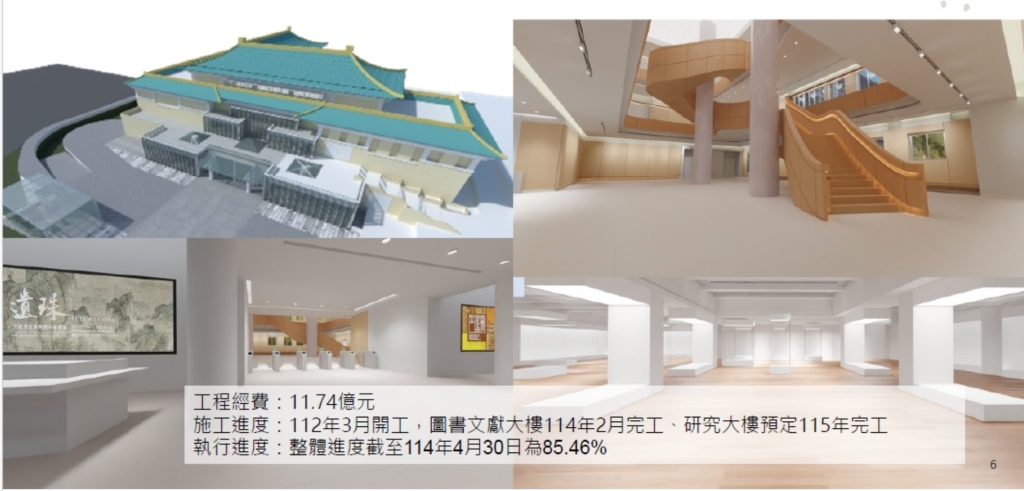 副院長黃永泰著重報告「新故宮計畫」的執行進度。北部院區行政大樓及圖書館新建工程已於2024年10月竣工,2025年春節後陸續搬遷進駐。第二展覽館已於2025年2月10日竣工,將配合大都會特展6月開館啟用。「至善路入口無障礙通道新建工程」現已開啟招標作業,俟完工後將大幅改善北部院區交通動線及無障礙環境,未來由捷運站出口,即可直接連結至故宮,方便度大大提升。