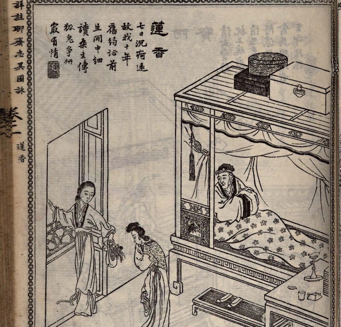 〈蓮香〉(圖1)故事描寫男子桑生夾在狐女蓮香與鬼女李氏的三角戀情中,某日蓮香發現桑生日漸消損,才發現原來桑生是被鬼女衰耗了精氣,進而苦勸桑生勿再與鬼女往來。但桑生兩邊都不想捨棄,便質問蓮香:「狐狸精不也會採集人類的精氣嗎?」蓮香道:「世有不害人之狐,斷無不害人之鬼,以陰氣盛也。」意思是,狐狸精如非刻意採補,便不會對人造成危害;但鬼就不一樣了,鬼女即便沒有害人之心,但因陰氣太盛了,不論如何都會損傷人的精氣。