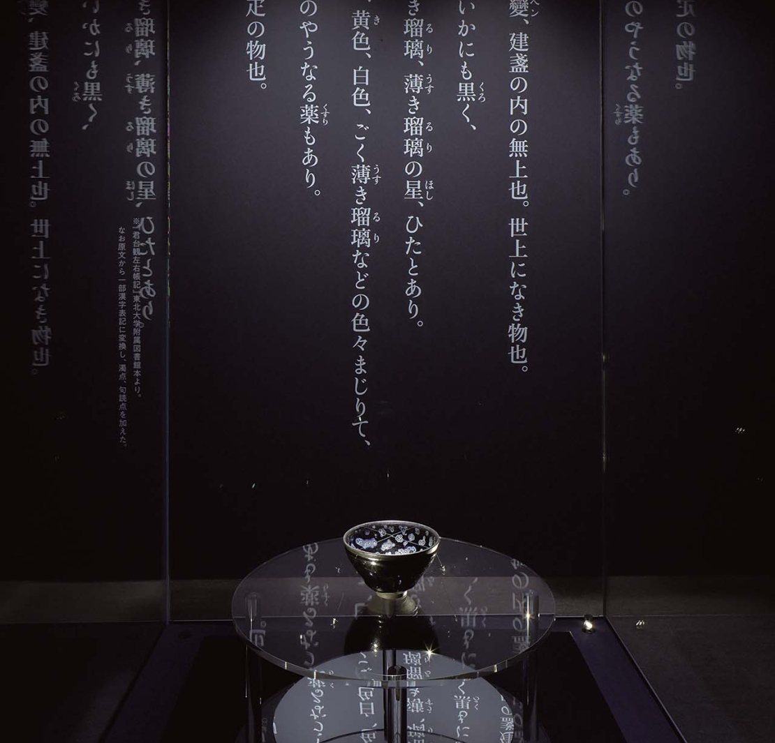 在日本,廣義上將用於點茶法的黑釉碗,稱之為「天目」,其名稱源於元代名僧中峰明本所居住過的浙江天目山。據聞留學中國的日本僧人們為求得禪宗教義,登上天目山修行,於歸國時,他們將作為其修行之一環的飲茶習慣連同茶碗一起帶回日本,並以曾經的修業聖地之名作為茶碗之稱呼。在展廳的壁面上,揭示著《君台觀左右帳記.土之物》中與建盞、吉州窯茶盞,以及灰被天目等與唐物天目有關的記載。《君台觀左右帳記》為室町時代足利將軍家「座敷飾」的裝飾指南(「座敷飾」係指以美術品,如書畫、陶瓷器等唐物,裝飾茶會、和歌會等會所空間),內容出自當時侍奉於將軍家中,負責藝能、茶道等事務的同朋眾之手。這些記載呈現了他們所認知的唐物天目的各種特徵以及評價,希望觀者能一邊對照著文字,一邊鑑賞作品。