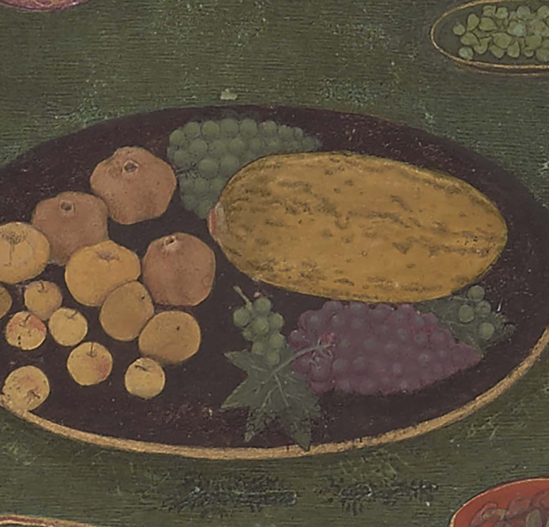 在〈賈汗吉宴請波斯君王沙.阿巴斯〉(圖1)此幅虛構兩國之君同席宴飲的名畫中,除了可見到中國瓷器、義大利威尼斯酒杯、波斯金屬器,更有一盤象徵蒙兀兒王室中亞故鄉的水果,如:蘋果、葡萄、香瓜等(圖2);另一盤則有自美洲引進印度栽培的鳳梨,與印度盛產的芒果、香蕉之屬(圖3)。對意圖向對方展現國力的賈汗吉而言,除了精美的器物,來自國境內外的各樣水果更是國富力強的關鍵指標,而皇帝心中最頂級的美味──芒果,自然是此類重要外交場合的一環。