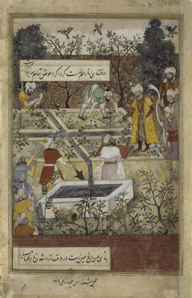 蒙兀兒皇室對於園藝、果樹栽培技術極為重視。巴布爾相當著名的一樁事跡是他初到印度時,百忙中仍勉力撥出時間興建一座栽種各式花果樹木的庭園(圖7);歷代帝王、后妃們也都相當重視皇室庭園的美觀與物種多樣性,特地從波斯等地延攬園丁並帶來各式新品種的種子。