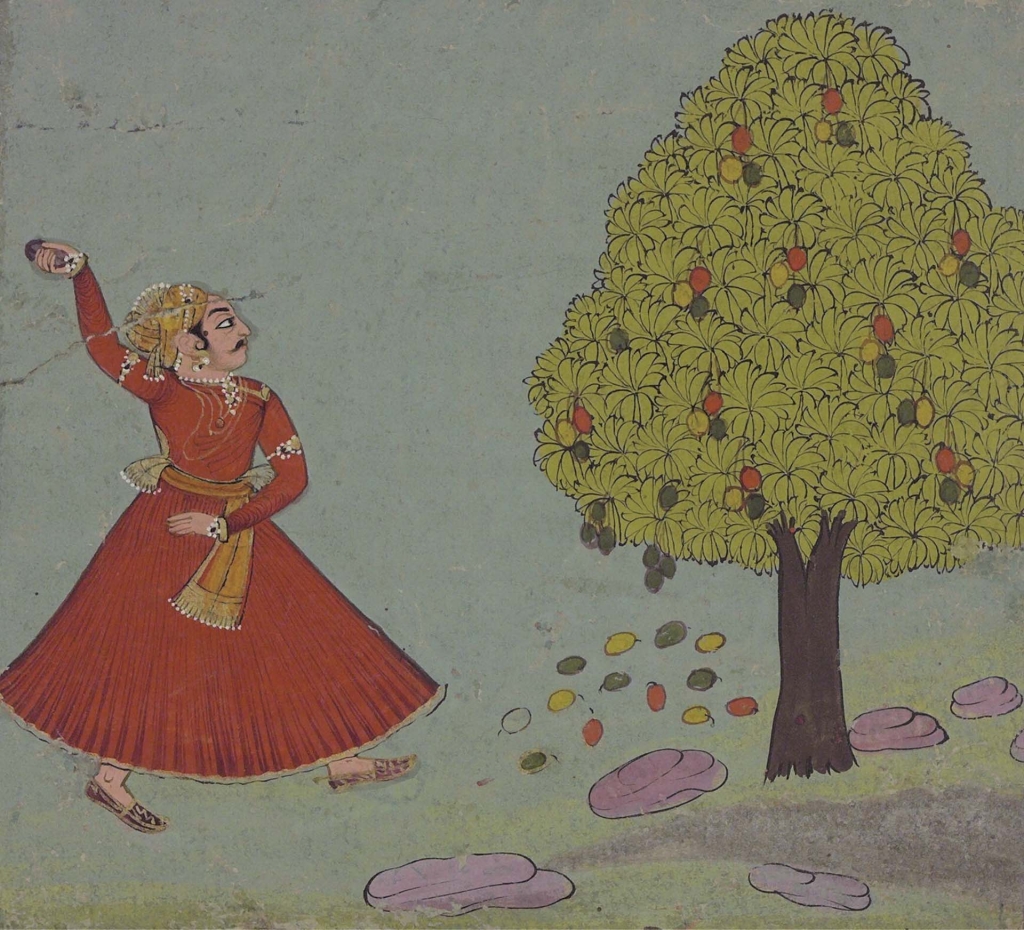 除了蒙兀兒朝廷,印度其他地區亦留下許多芒果相關的作品,如此幅拉加斯坦(Rajasthan,位於印度西北方)風格繪畫〈朝芒果樹扔石頭的男子〉,畫中紅衣男子使勁想將枝頭上飽滿肥碩的芒果打下來大快朵頤,畫面活潑溫暖的色調與平易近人的生活況味,為廣大印度民眾對於芒果的熱情留下生動鮮明的見證(圖8)。