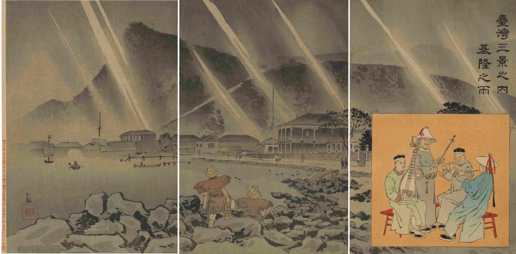 最後一件展品,是《臺灣日日新報》發行的明信片組,為「臺灣八景」基隆旭岡、淡水、八仙山、日月潭、阿里山、壽山、鵝鑾鼻、太魯閣峽,加上「二別格」臺灣神社及新高山(玉山),合為「雙絕臺灣八景」一套十張。其中有著吉田初三郎擅長的鳥瞰圖,也有著風景畫。唯一的近景與夜景是承繼著小林清親「光線畫」的特色、題名「淡水暮色」(圖24)的淡水月夜港邊情景,燈光河面倒影似回應著第一單元的小林清親〈隅田川夜〉景象,臺灣觀眾也能在觀賞間找到彼此時空的共振。