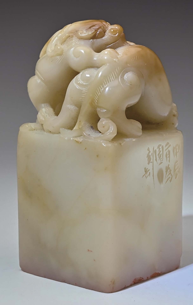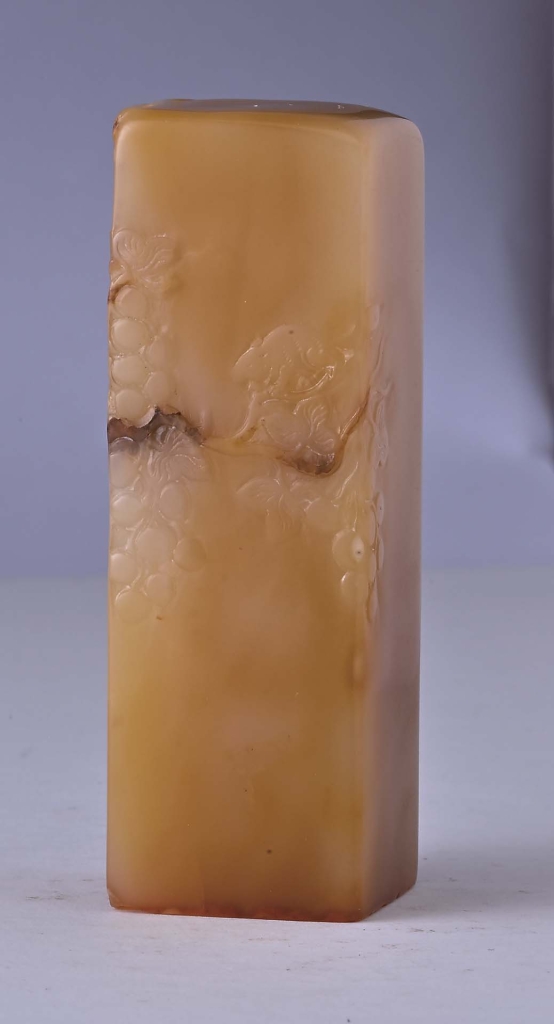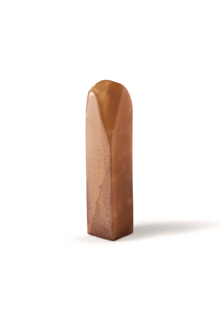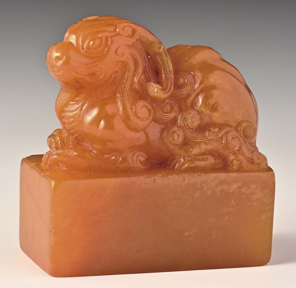 印章發展至明清,漸由實用擴及藝術雅玩,印鈕與印身雕刻亦愈見精緻典雅,而後更發展出「薄意」雕刻。「薄意」正如其名,乃以極淺的浮雕刀工刻製,體察石材之筋絡、色澤及紋理,拓之如畫,令人不忍釋手。