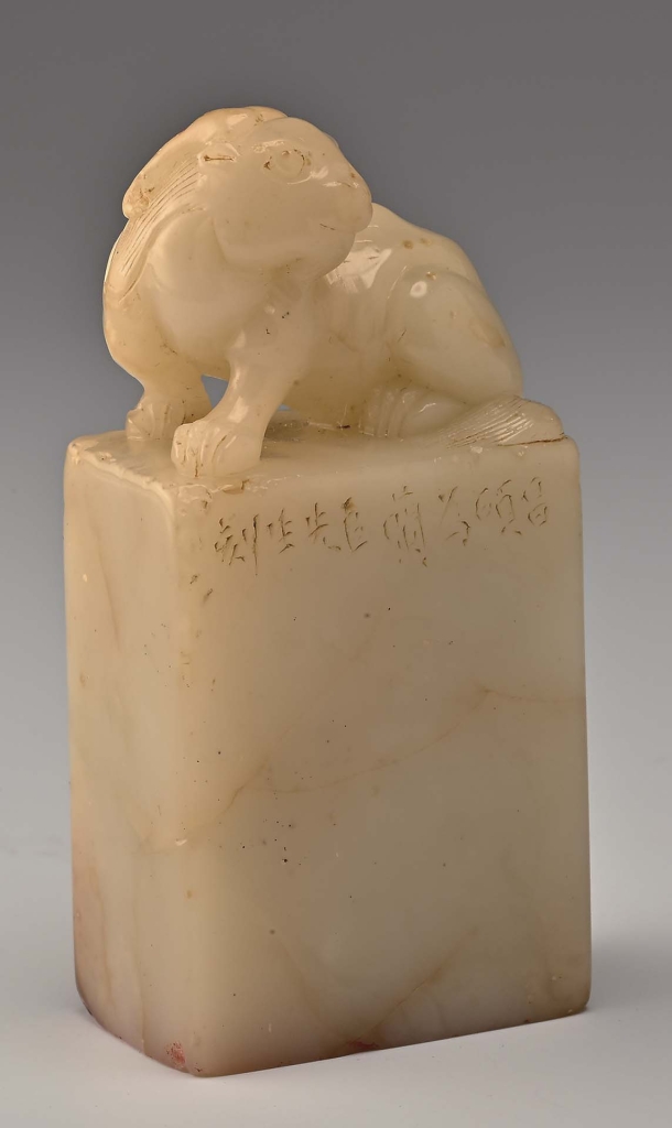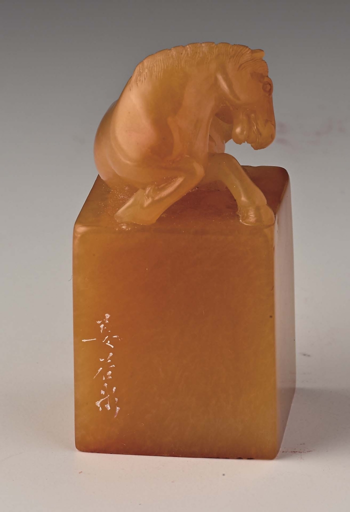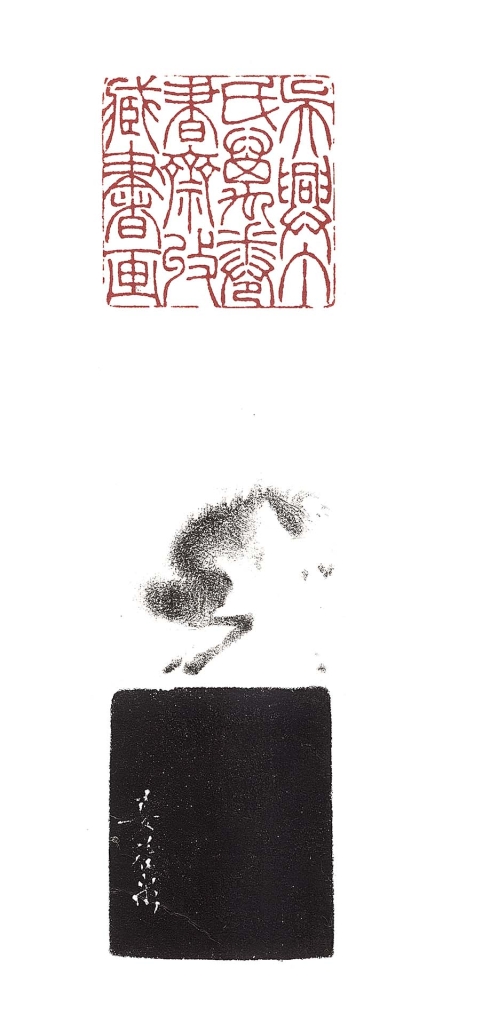 「吳興丁氏萬卷書齋收藏書畫」一印,為清代金陵篆刻家姜煒所作,朱文精刻,章法嚴整中見靈動,篆法渾厚古雅,「骨氣豐潤,方圓絕妙」,具玉筋篆的圓轉,與漢印的雄健風貌。印文所示,為清代江南著名藏書世家丁氏家族,藏書尤以乾嘉時期為盛,有「吳興書富第一家」之譽。「萬卷書齋」所藏書畫之印,當為丁氏鑑藏印之一,標示出藏書規模,亦展現士人以書畫為治學與雅好之象徵。印鈕則寫實細膩、姿態傳神,且「身體與腳姿態間做造型鏤空,實具清初福州名家雕工技法之特徵,若非重要名家,不會輕易在高貴的田黃石上,浪費材積重量的耗損。」