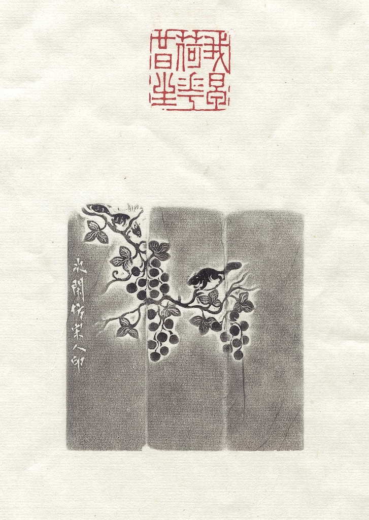 趙之琛為西泠八家之一,刻「我早荷花廿日生」松鼠葡萄紋芙蓉方印,即屬薄意佳作。古人將六月二十四日定為荷花生日,印文暗示印主生日,印身則以淺浮雕表現松鼠攀於葡萄枝上,意寓繁衍不息、枝藤綿綿、結果豐碩等意涵。這類題材與淺浮雕形式在17世紀即已盛行,趙氏常以葡萄、荷花等吉祥紋飾點綴印面或邊款,與印文意涵相互呼應,形成圖文合一的藝術效果。