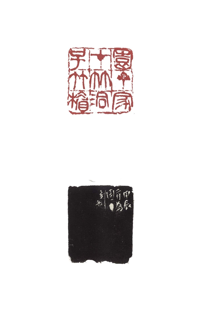 吳昌碩與閔泳翔相識三十餘年,據其自述「奏刀三百餘石」,為其治印之數為私人中最多者。此兩方芙蓉石印,朱文「園丁家在竹洞號竹楣」與白文「竹楣」別具代表性。「園丁家在竹洞號竹楣」九字朱文印,採用井字格章法,融大小篆於一面,巧妙利用筆畫多寡與結構呼應,對「竹」字的筆畫簡略則以「園」、「洞」字調節疏密,整體線條圓中帶方,錯落有致。字法參考〈石鼓文〉,融沖刀之勁與切刀之沉,兼以殘破留白,使印面氣息古拙雄渾。印面格線亦帶書寫筆意,各字與邊格互讓、互依,使構圖呼吸流動,形如畫作布局。展覽現場以書印並呈,可顯示二者之間的融通互現。