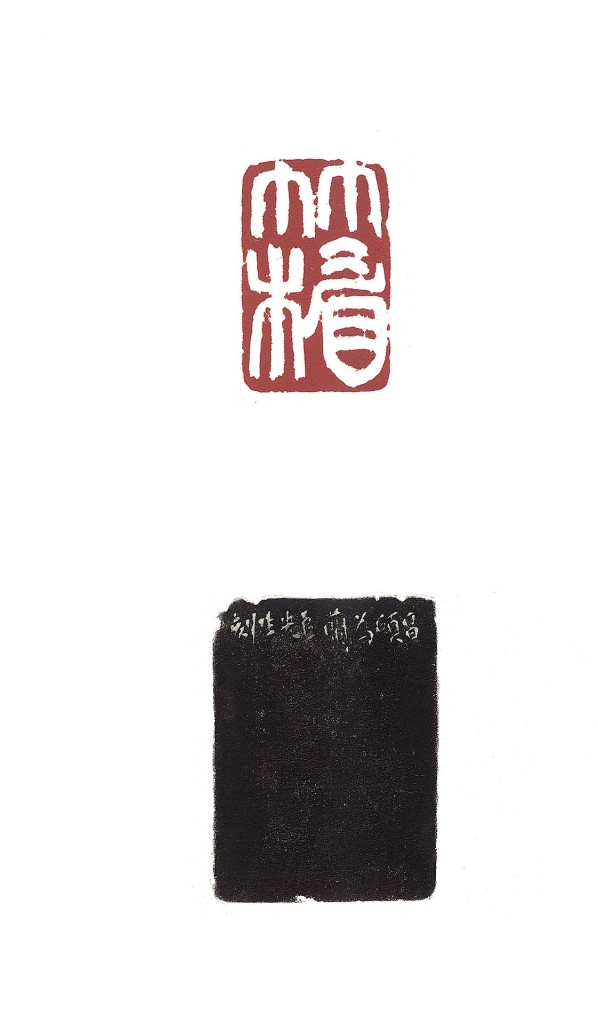 另一方「竹楣」白文印,為縱長構圖,二字一繁一簡,吳昌碩透過字體伸縮調整視覺重心,筆法兼用中鋒與偏鋒,柔中帶剛,刀筆相濟。尤其「眉」字作飛白效果,筆意有如枯筆寫意,石面局部略施損筆以顯古氣。字形排列與印面呼應,形成空間層次與視線流動。此印並與「竹楣平安」、「竹楣先生」等多款相關印章相互對照,可見吳昌碩對閔氏「竹楣」之號特別重視,反覆探索字構與章法關係。