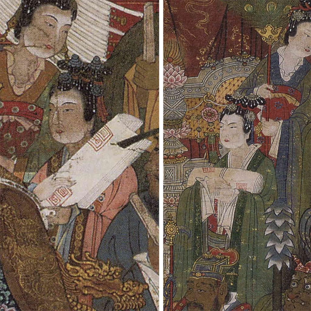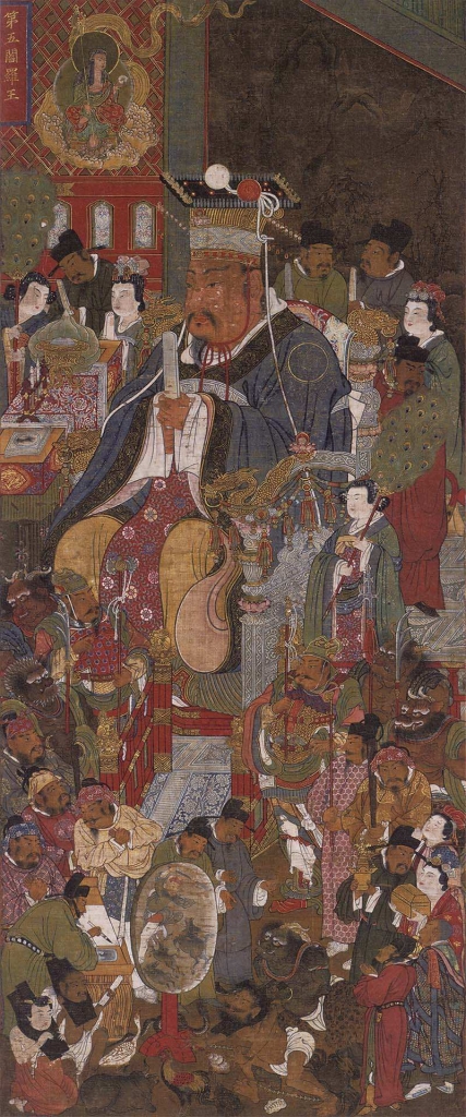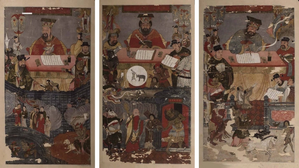 十王的概念,最初源自中國古代對陰間官僚體系的想像。最早的死後審判並不具備這樣清晰的結構,「十王/十殿」的次第性,大約在晚唐五代之際逐漸定型。敦煌石窟中的《佛說十王經》變相圖卷,已可見十位王依序審判亡者,根據其生前功過做出裁決。這種節奏分明、關卡式的審判流程,恰好為圖像的展開提供了結構:從第一殿秦廣王到第十殿轉輪王,每一王就是一場審判、一個轉折,彷彿亡者需逐關通過一場地獄版的大地遊戲。