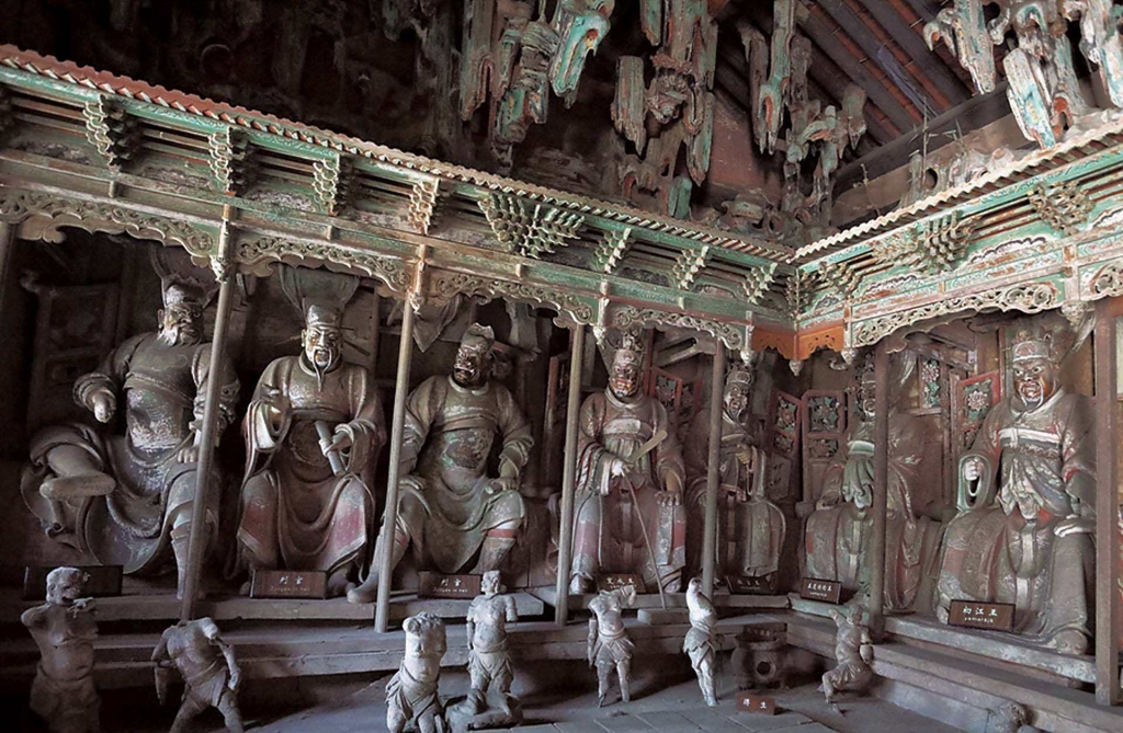 最早的相關圖像可回溯至東漢墓室畫像石中的大王審判的地獄場景,而十王殿成為一個立體建築單元、宗教空間,目前可追溯至元代元貞年間(1295-1297),當時已有東嶽殿設置酆都與十王等分殿的記載。這不僅顯示官式道教對地府體系的制度化整合,也標誌著十王圖像空間化的轉折點。此類殿宇延續十王圖的視覺邏輯:每王分居一殿、順序排列,廳中設有審判場景的塑像或壁畫,亡者或信眾依序參拜、誦經,實際走過一次地獄旅程,彷彿親歷其境。
