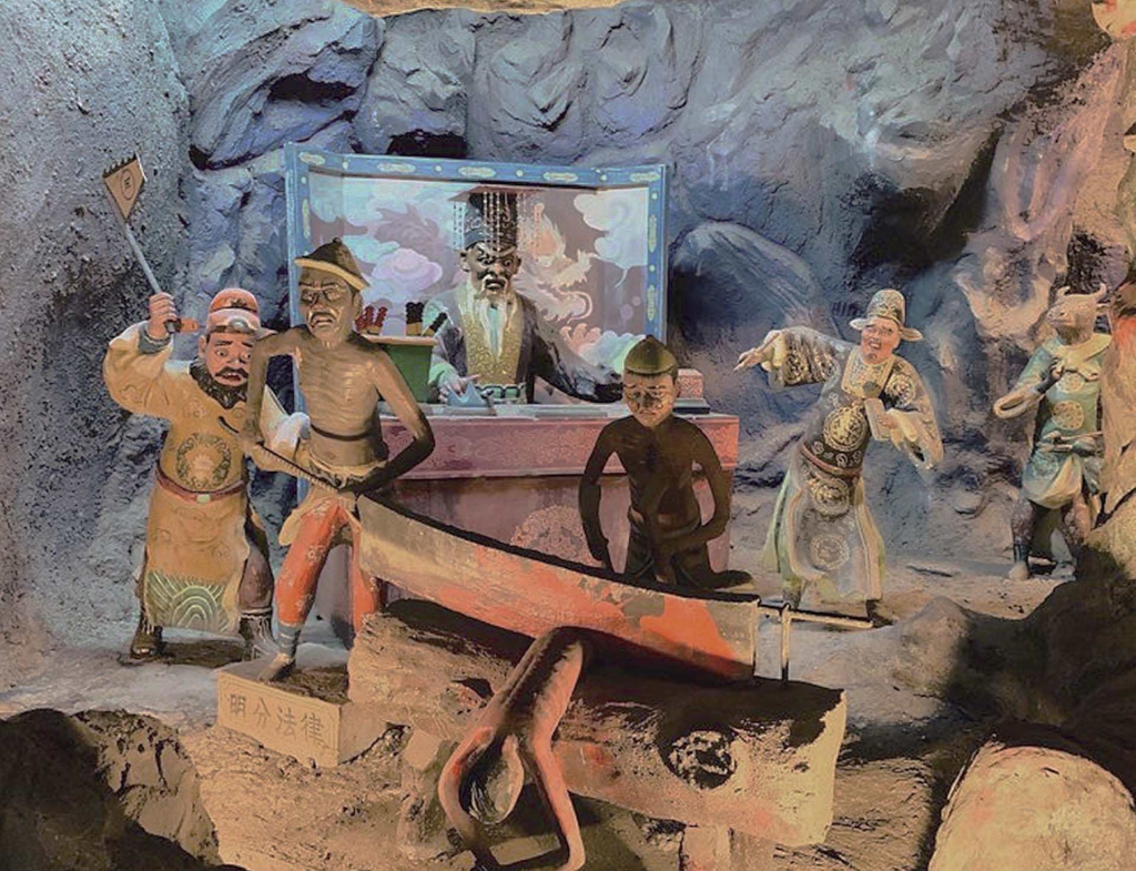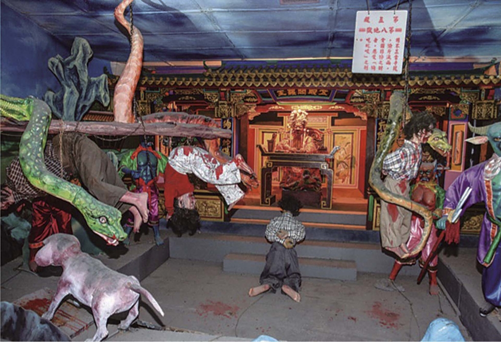 十王審判的視覺文化,出現了從宗教場域延伸至融合娛樂與觀光產業的體驗,信仰儀式轉化為文化消費。東南亞最早的代表性案例,是1937年開幕的新加坡虎豹別墅(Haw Par Villa)。其1950年代增設的「十殿閻羅」展區,將地獄審判與刑罰轉化為立體雕塑與劇場化場景,配合導覽動線與文字說明,觀眾得以逐層深入、觀看各種罪與罰的對應地獄(圖12)。雖以觀光為主,未必具備宗教功能,但超越《十王經》文本記載的場景、透過加強「遊觀」與「過場」表現不同地獄場景的串連想像,成為十王審判視覺發展的動力:營造下地獄氣氛的路程、十殿審判先後次第、視覺懲戒與因果圖解。觀者在園區中移步換景,彷彿參與一場帶有疏離感的現代版十王審判體驗。