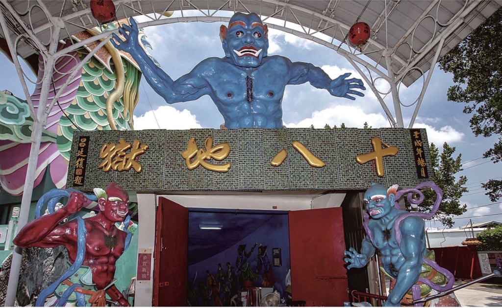 在臺灣,清至日治時期本就有在法事中使用十王圖掛軸與寺廟祭祀十王塑像的紀錄。有趣的是,戰後的臺灣現代社會,於1970年代出現了幾例將這些十王審判的傳統視覺與流程,轉化成「宮廟地獄遊覽劇場」的案例。如八卦麓的彰化南天宮建於1971年、還有麻豆代天府在1979年落成的「十八層地獄」(圖13),可說是信仰場域和大眾娛樂化結合的地獄體驗版本的代表。