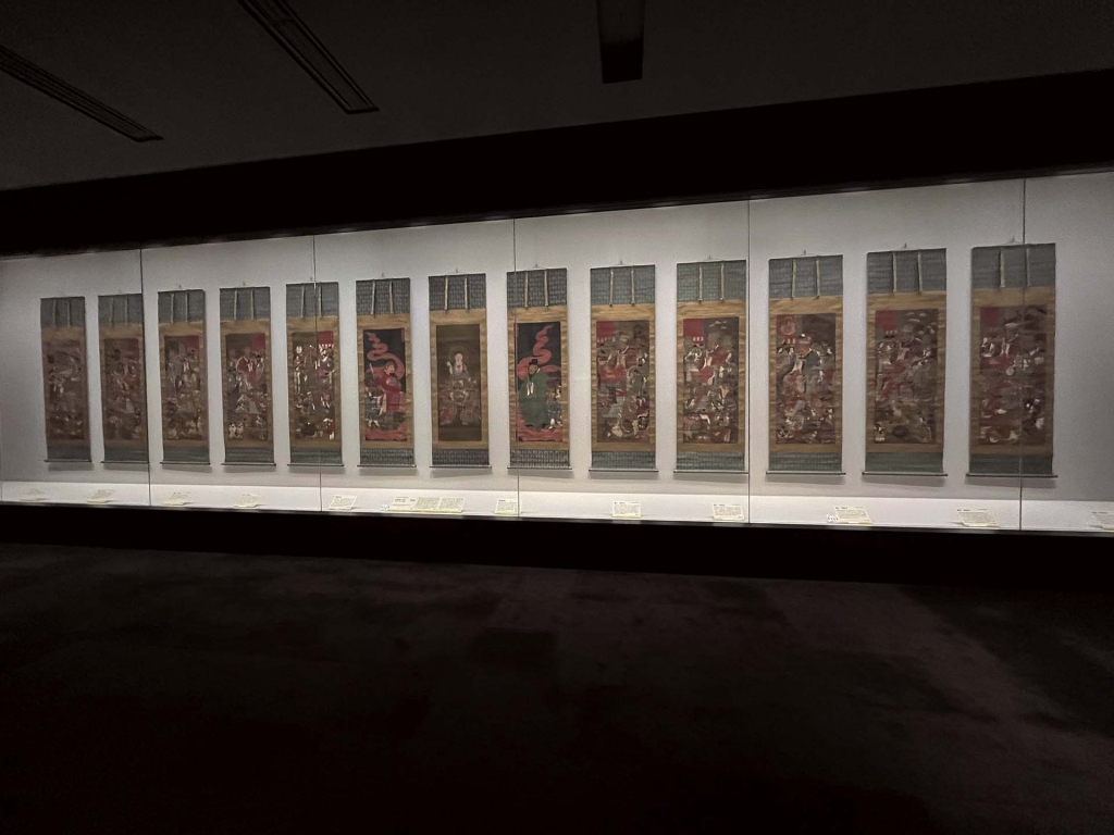 第二組則是1915年收集入館的十幅設色紙本《十王圖》(圖10),尺寸約為每幅85×48公分。這套圖像以紙本彩繪方式製作,構圖完整且保存狀態良好,從第一殿秦廣王至第十殿轉輪王,各殿皆配有審判場景、牛頭馬面引導罪魂、旁有地獄刑罰描繪。畫中不僅呈現十位閻王各自執掌的罪刑判別,還包括具體懲罰圖像,如拔舌、剖腹、投入油鍋、火刑等。此外,幾乎每幅畫面中皆出現一位手持寶珠或錫杖的菩薩形象,被認為是《地藏本願經》中「地獄未空,誓不成佛」的地藏王菩薩,象徵即便墮入地獄,人們仍有悔改與救贖的可能。第五殿的〈閻羅王〉畫中亦出現《目連救母》故事,強調孝道作為轉化罪業的重要途徑。