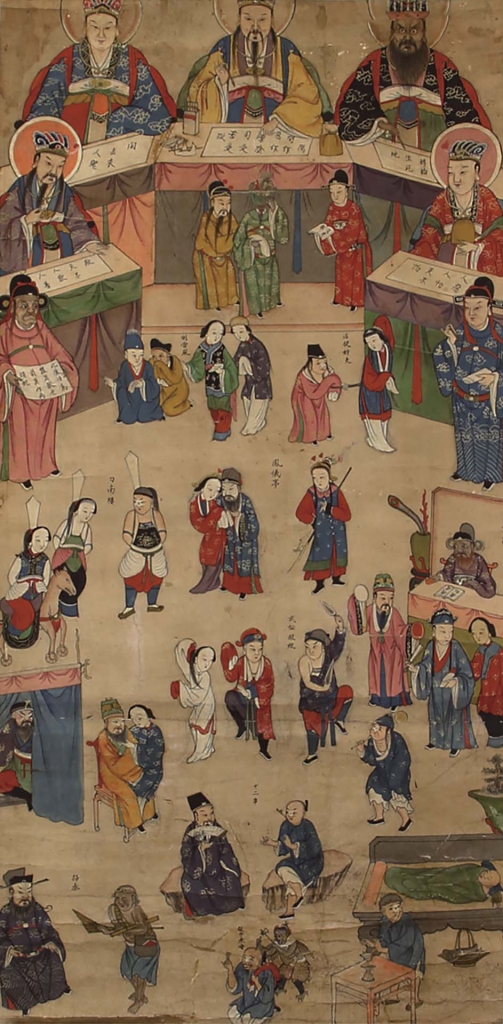 最後一組為1923年收集入館的五幅設色紙畫,內容同屬十王審判主題,畫面構圖更為簡約粗製,人物造型略帶民畫風格,品質不比前兩套精緻,推測可能為家庭薦福或寺廟日常法事使用,屬於日常使用的類型。