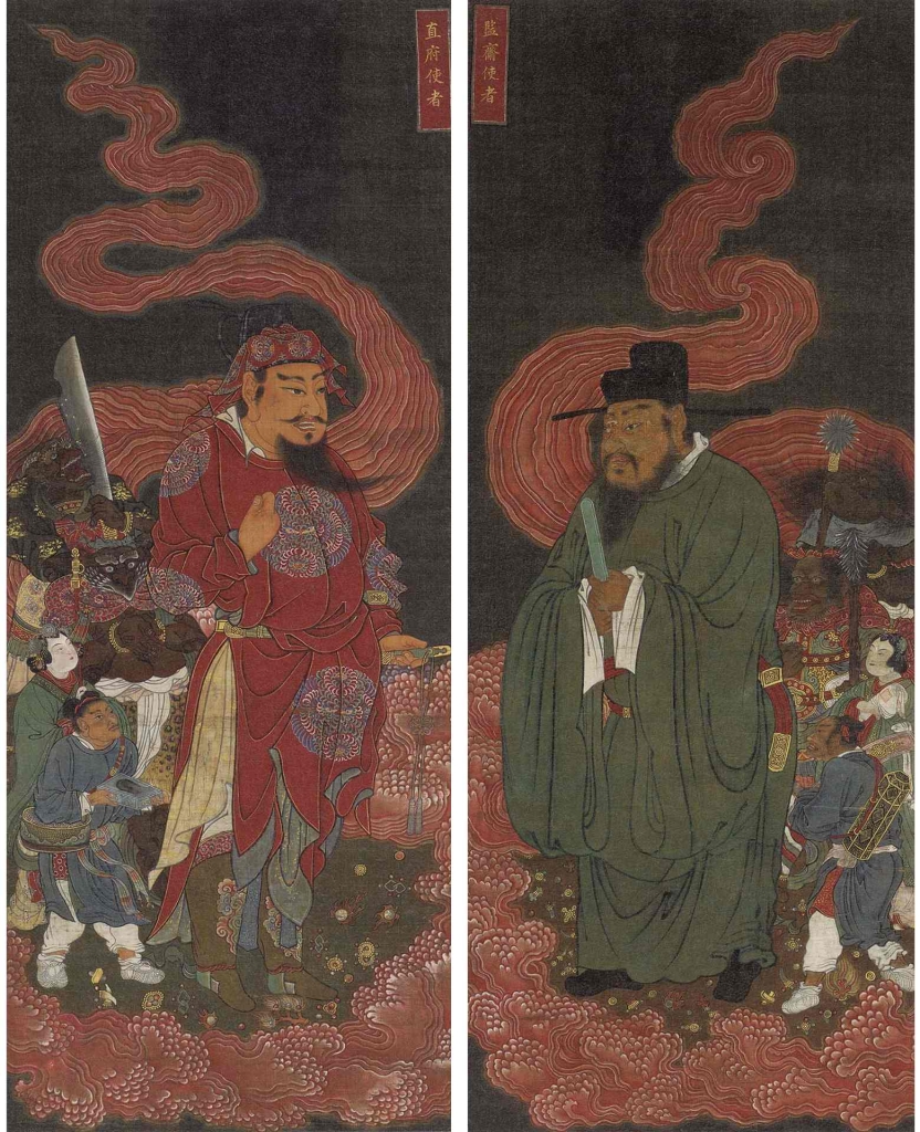 特別的是,十二幅中有兩幅獨立描繪地獄使者,其榜題為「監齋使者」與「直府使者」(圖5),與朝鮮佛教中兩人一組,負責引領亡靈、審查罪業與傳達經文功德的專門使者職司一致。「直府使者」、「監齋使者」為主題各構一幅,除了具有對稱性的構圖,特以榜題強調使者身分的角色,在套組畫作中具有更強烈的獨立性與戲劇性表現,不再只是邊緣小角。這在宋元寧波系及日本的十王圖,尤其掛軸畫中非常少見,多被視為朝鮮半島文化中佛教圖像表現特色。