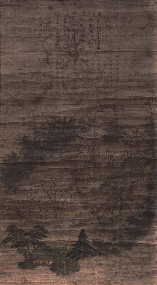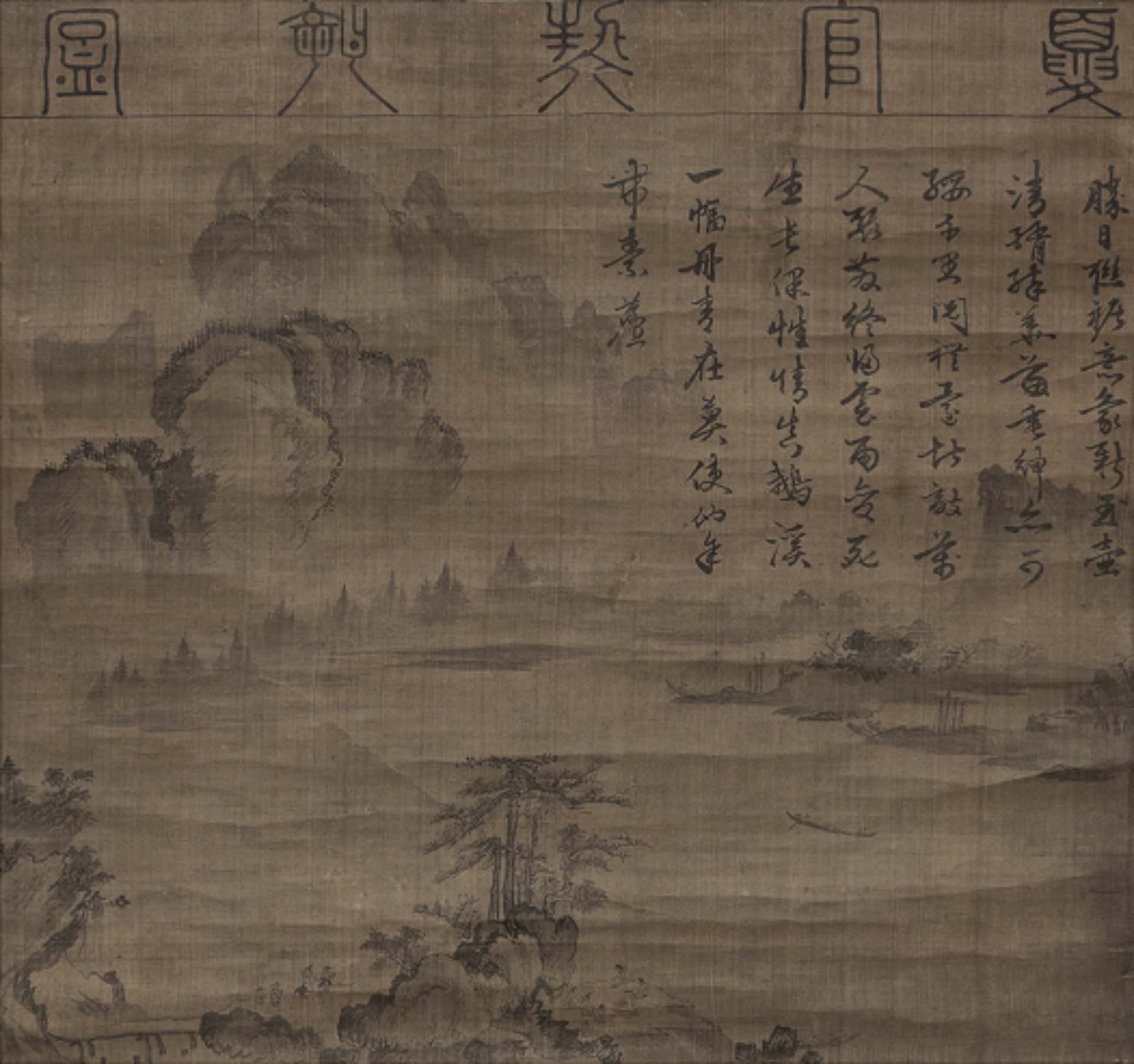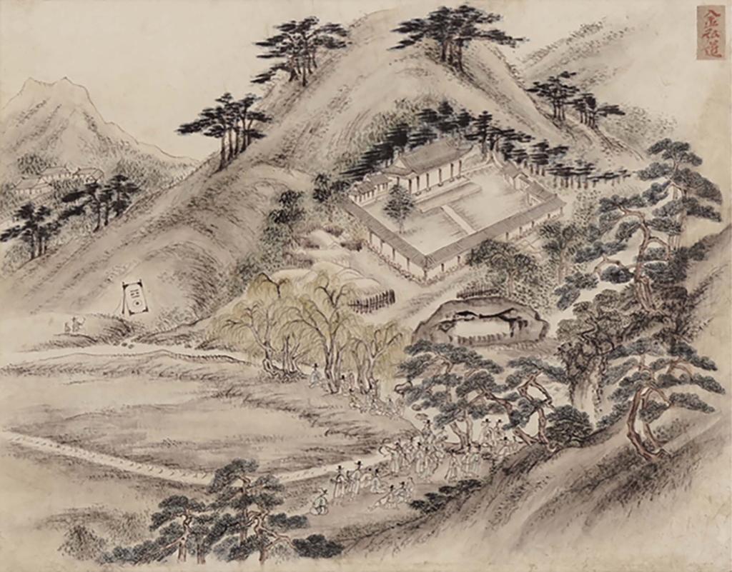 〈漳州茆庵圖〉為尹汲(1697-1770)於1746年受君王英祖(1724-1776在位)御命製作。畫面最上方透過英祖親自作詩,表明他讀了朱熹(1130-1200)的文章後,對「沂水舞雩」獲得領悟而製作此畫。這句話表達了英祖追求純粹內心與公正統治的理想君主形象。