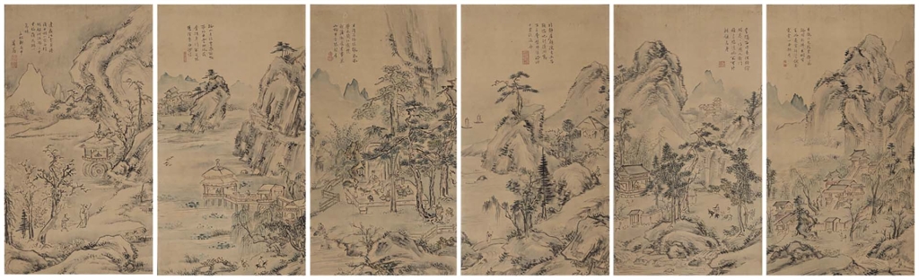 19世紀 李昉運〈山水圖六幅屏風〉,紙本水墨設色,
