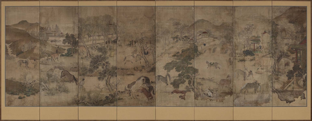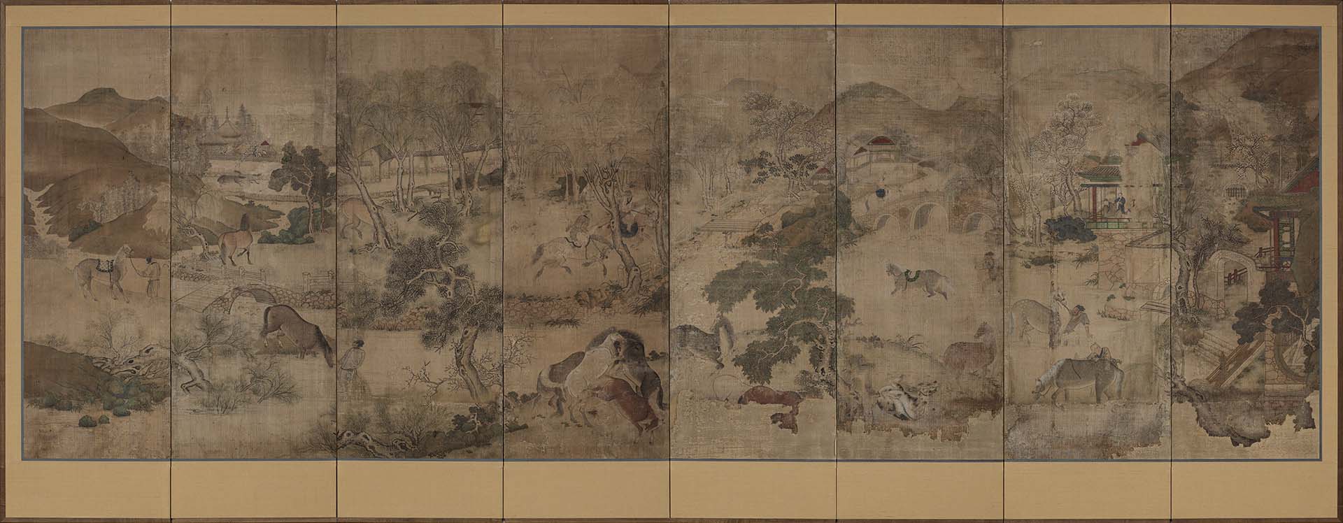 〈牧馬圖八幅屏風〉18世紀中後半,絹本設色,