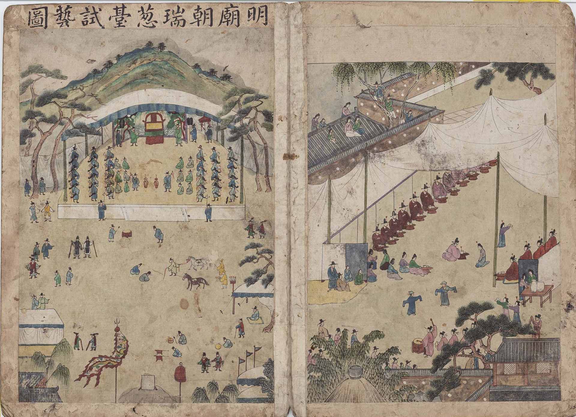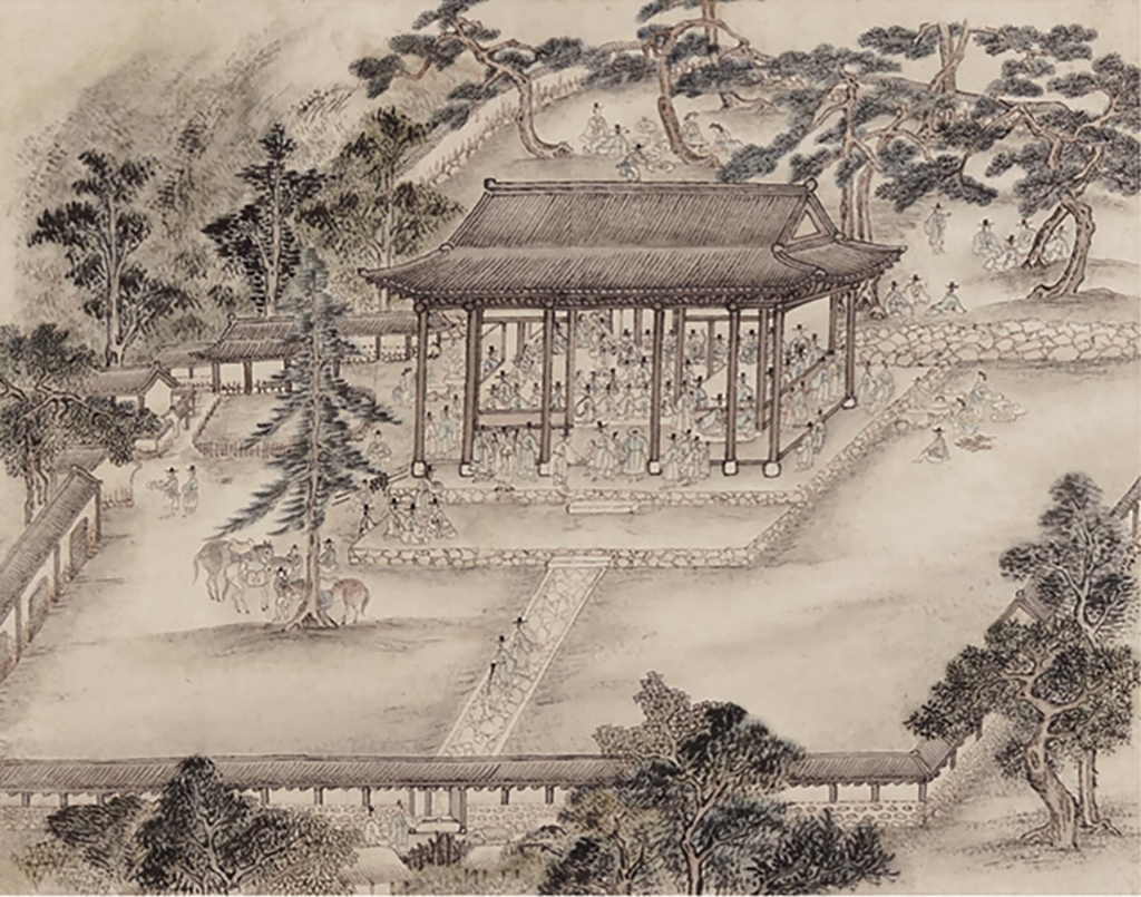 宜寧南氏為慶尚南道的名門家族,其家族中有三位經歷中宗、明宗和宣祖三朝的臣子,分別參與宮中與私家的活動後製作的紀錄畫,與座目和序文並列。此類為防止原畫遺失損毀、進行「複本」描繪的「私家紀錄畫」,延續至到朝鮮後期仍有繪製。此次展出的為「家傳畫帖」的後代摹本。