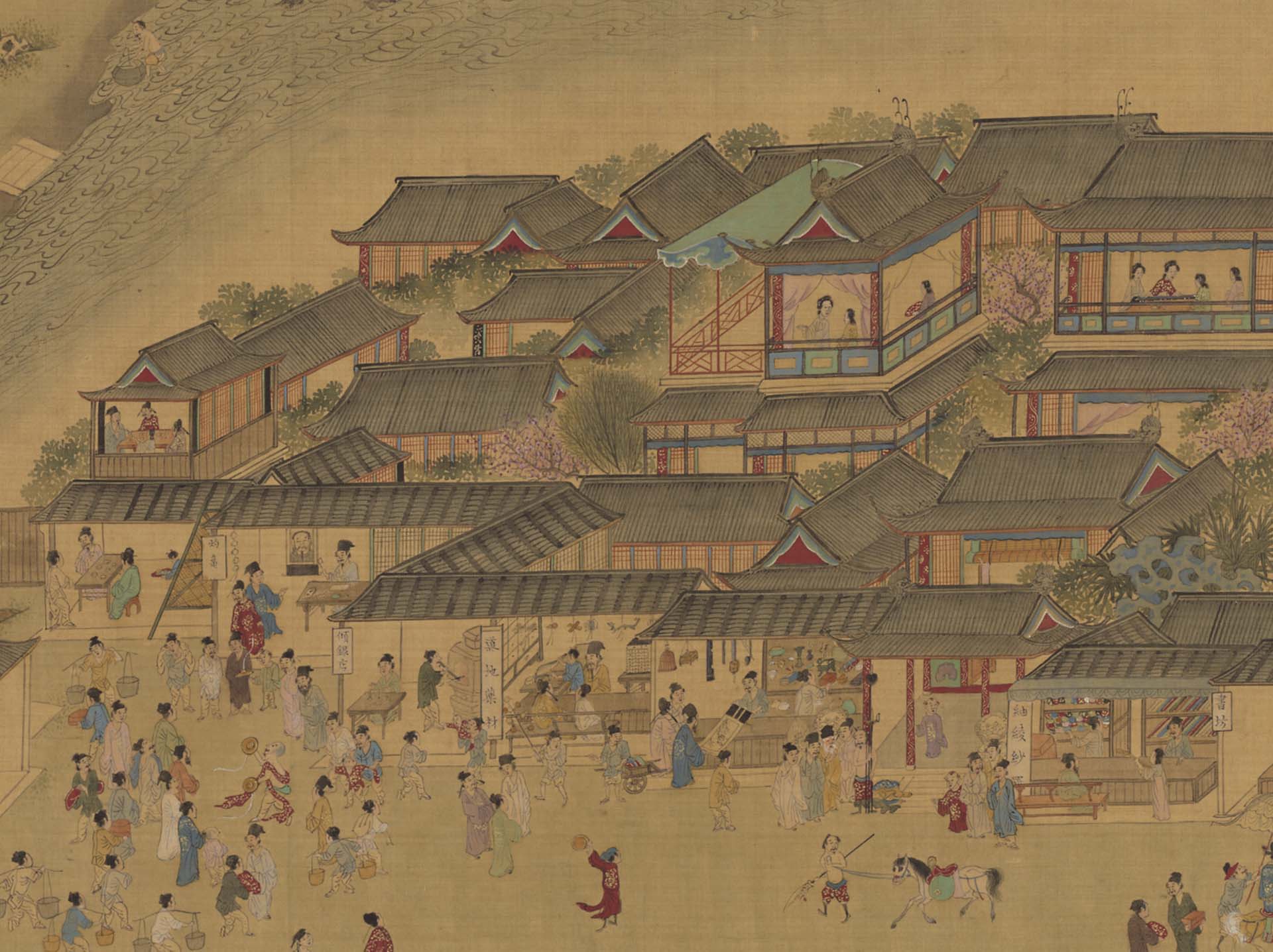 北宋張擇端所作的〈清明上河圖〉卷描繪的是首都汴京繁盛的城市景象,猶如電影運鏡,由郊區出發,沿著運河,隨舟船進入市區,行經人潮川流不息的虹橋、穿越城門、走逛繁忙的市街商鋪,畫中充滿蓬勃的生活氣息。蘇州片版本的〈清明上河圖〉雖然基本沿襲了張擇端的構景和市街主題,卻加入更多當代細節,製作出更為豪華鋪張的版本。