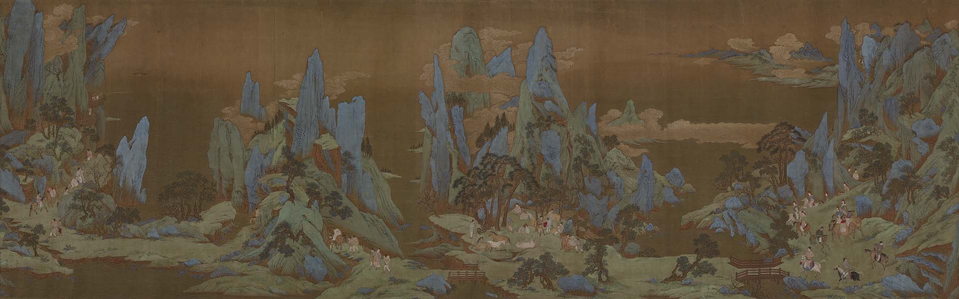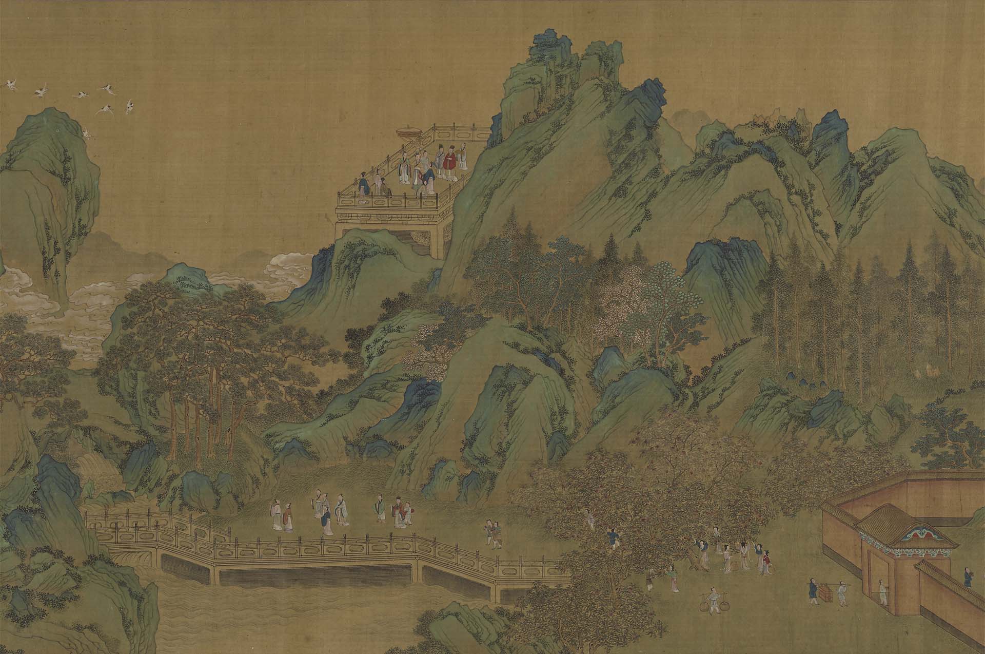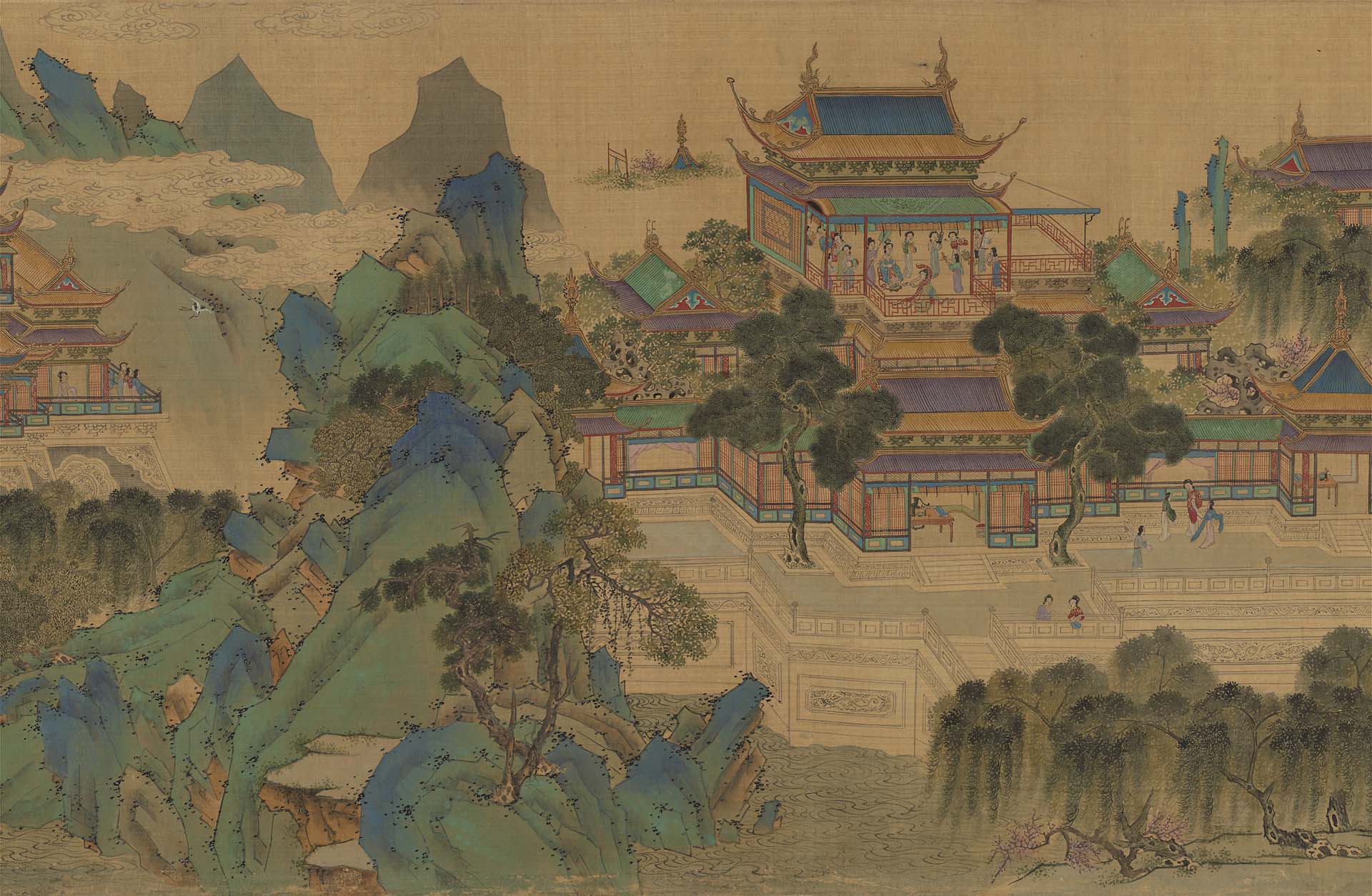 帶有吉祥寓意的仙人祝壽題材也相當受歡迎,傳仇英〈蟠桃仙會〉(圖10)一類的作品,亦有多本相仿之作,畫中都鋪陳了大面積的青綠山石。由此可見,縱使表現主題不同,以大幅青綠山水為場景的繪畫長卷,可說是蘇州片的主流風格之一。