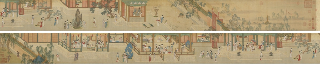 仇英的人物長卷〈漢宮春曉〉(圖11)為晚明宮廷仕女畫的巔峰之作,亦成為蘇州片託古常用的範本。畫中生動描繪後宮女眷富貴華麗的生活情境,畫風細膩優美,卷末有項元汴書記「值價貳佰金」。