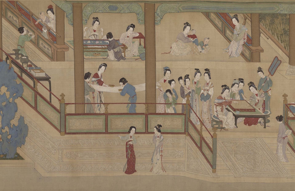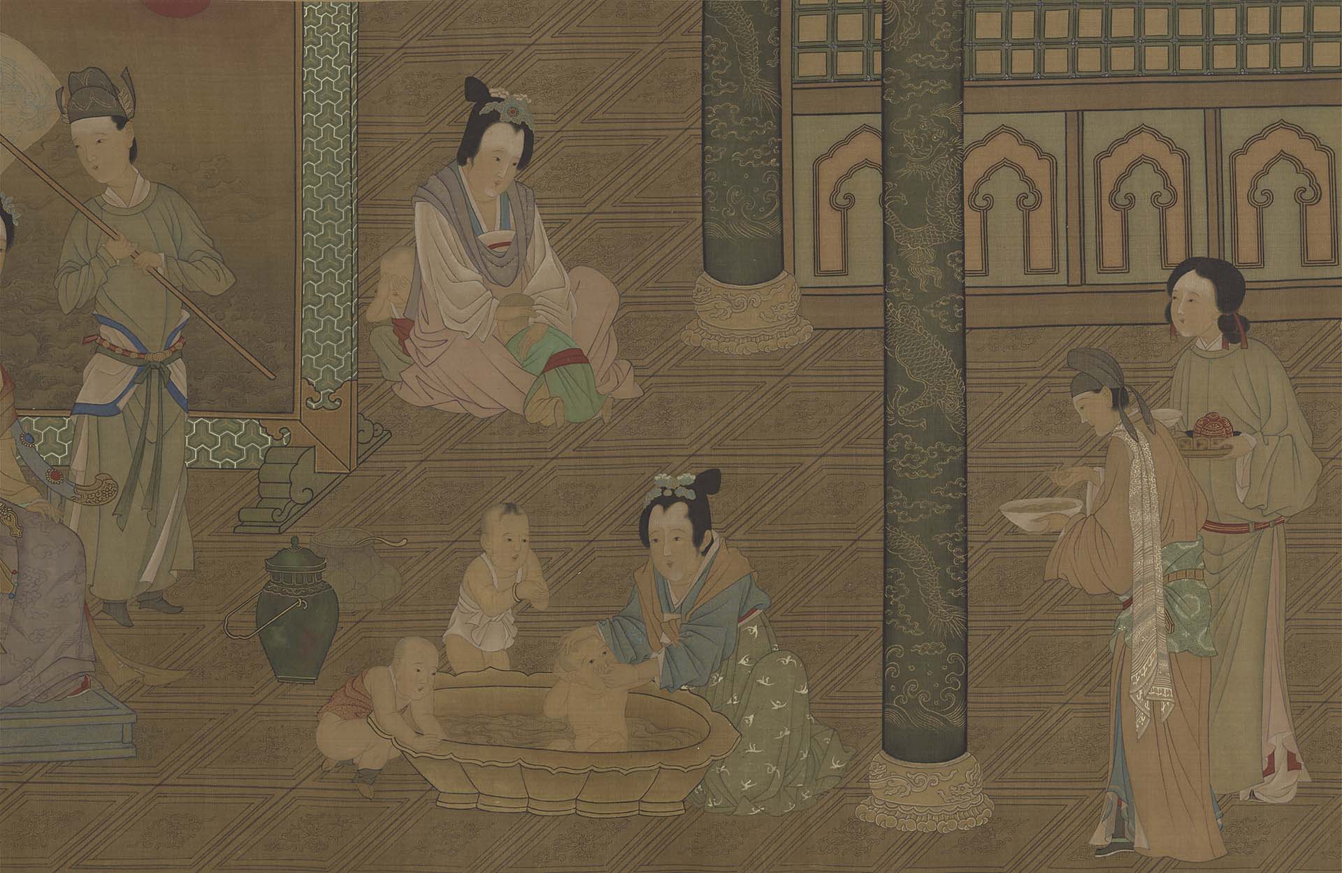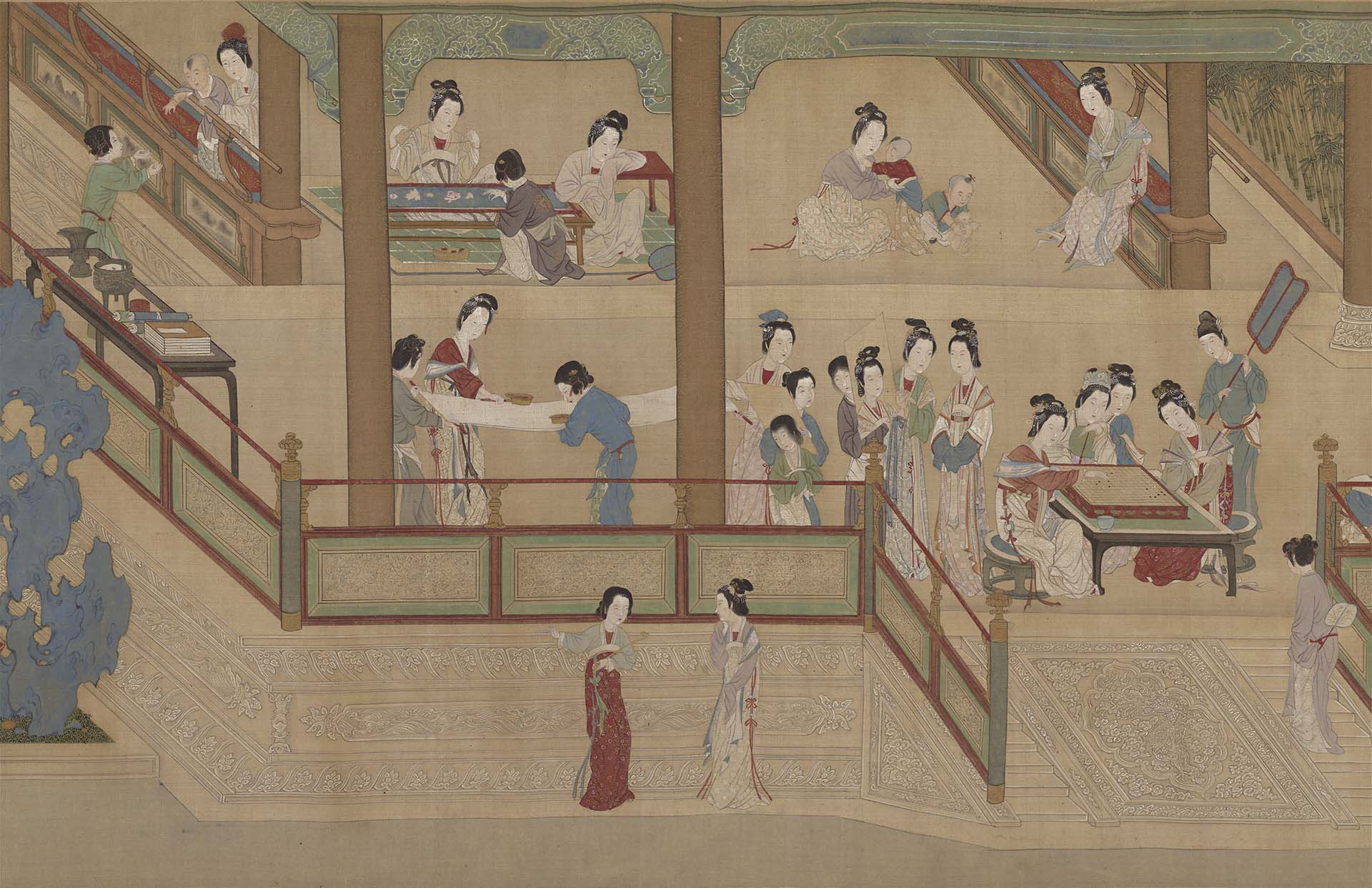 今存傳唐代周景元(據研究,周景元應為周景玄,即唐代人物畫家周昉)的〈麟趾圖〉(圖12),畫后妃宮女育養宗室子弟的生活即景,可見類同〈漢宮春曉〉的深宮場景與人物活動(圖13),為明人追摹唐代「周家樣」的作品,亦是蘇州片常見的繪畫主題。