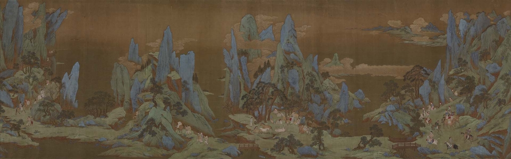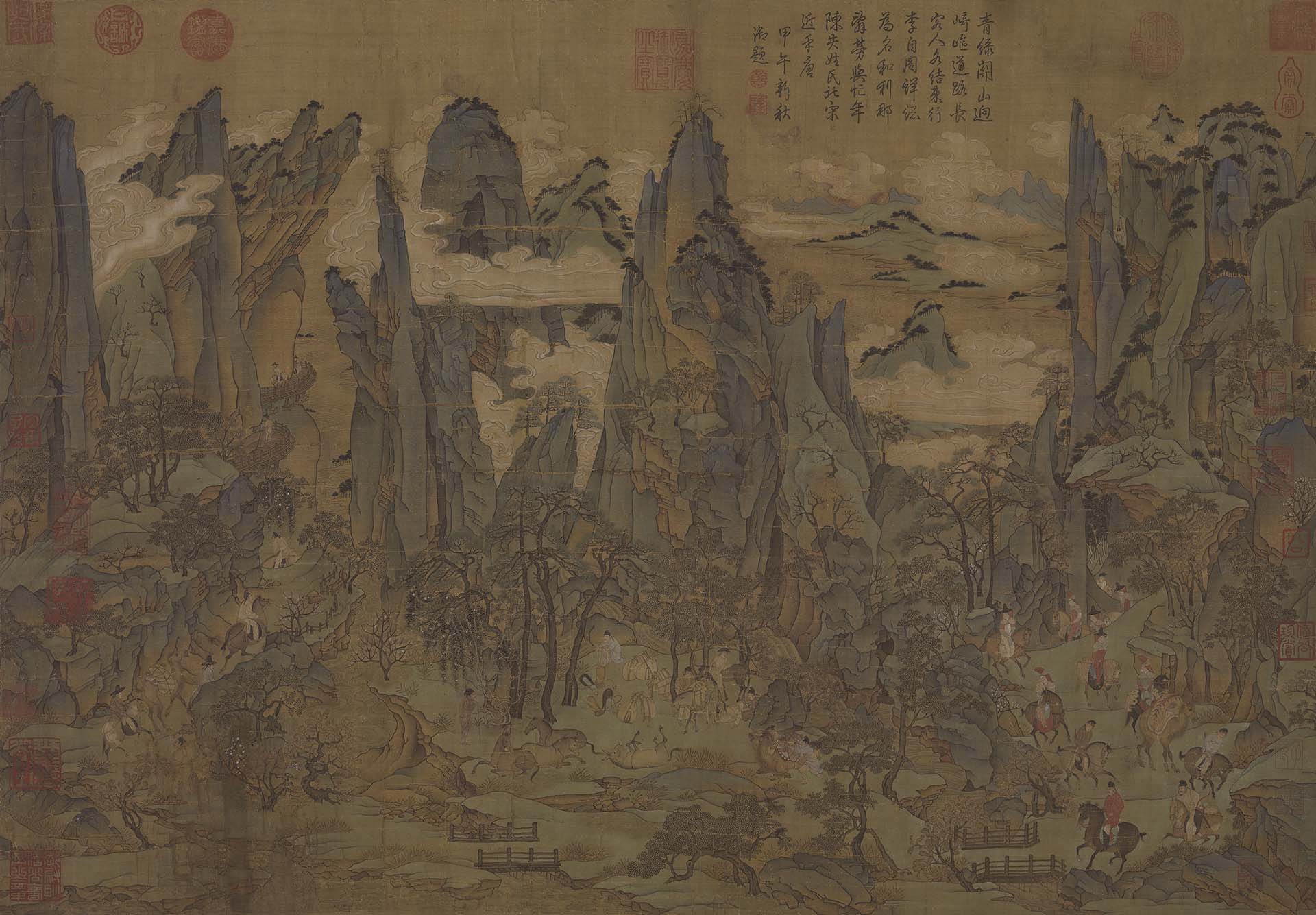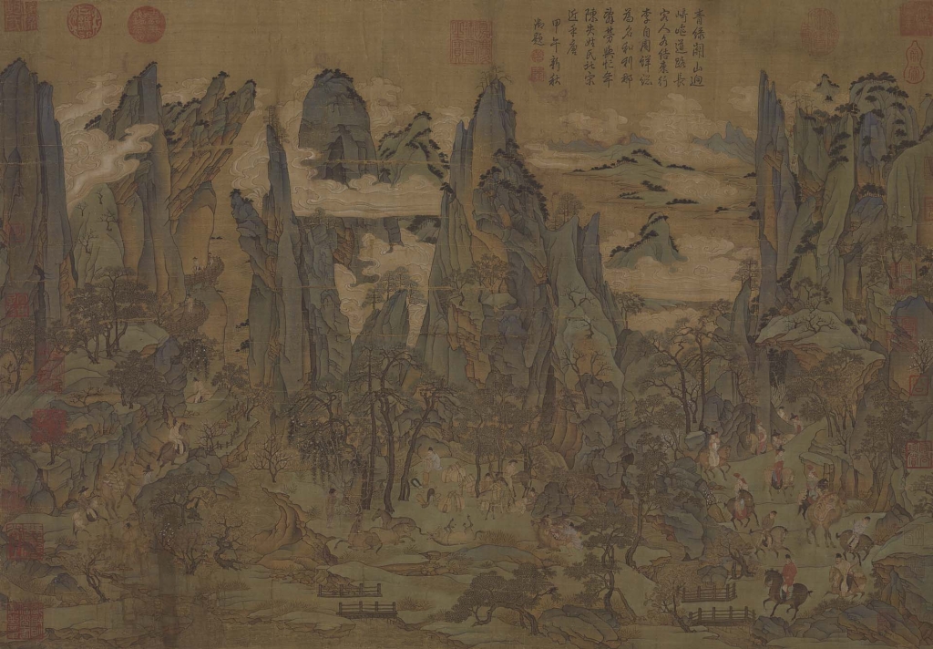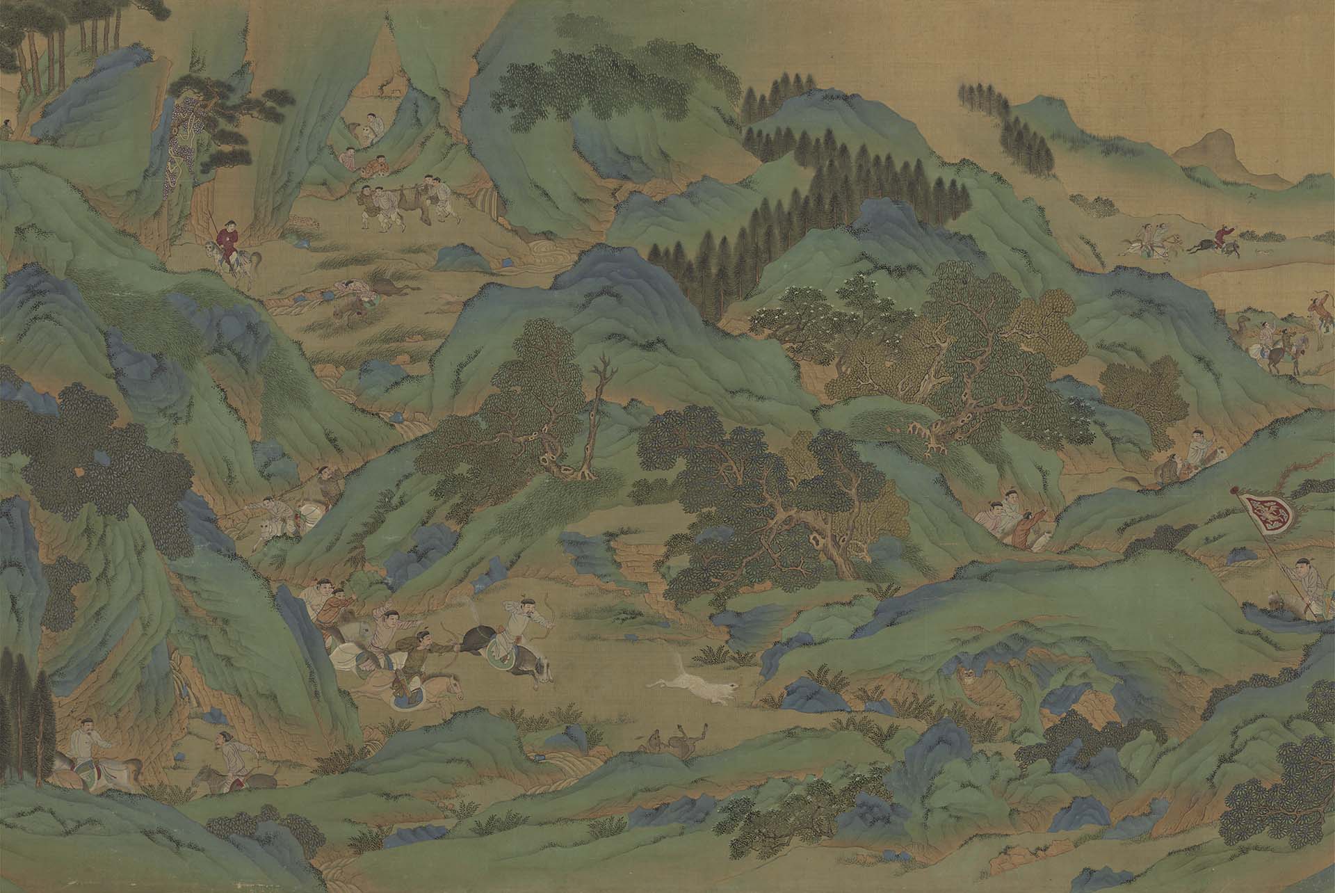 身為當代聞名的職業畫家,仇英的作品也是蘇州片仿造的範本之一。「上林圖」描繪富麗華美的皇家園囿「上林苑」,以及天子出行狩獵的盛大排場,今可見的〈上林圖〉(圖9)畫面情節如出一轍,全卷被濃豔的青綠山水綿延包圍,亦多安於仇英名下,甚有附會為宋、元人手筆者。