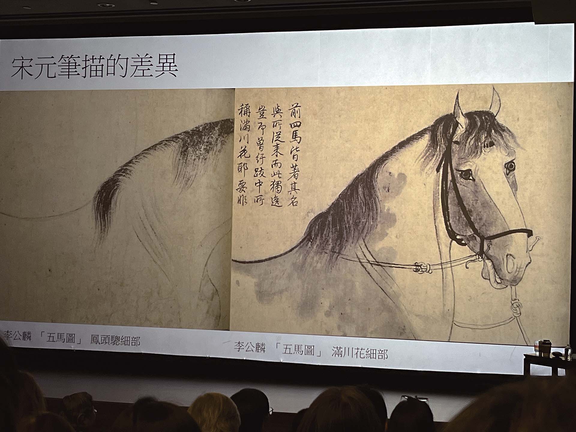 藉由細觀原蹟,〈五馬圖〉的創作歷程也呼之欲出。板倉認為第五匹馬背部、尾巴線條俐落且稜角分明,因此乾隆皇帝的判別無誤,即此幅為後添。類比趙雍(1289-1369)所繪馬匹線條,他進一步推測此幅畫者可能也活躍於元代中後期。而關於〈五馬圖〉歷經的順序改動,板倉透過題跋文字、第三、四幅接縫處的殘存墨蹟與周密《雲煙過眼錄》相關記述,推定以下三點結論:首先,李公麟原畫並無記錄馬匹訊息的文字,不過畫成後不久應即接成一卷並添寫。其次,原畫第四匹應是現已亡佚的「滿川花」,原畫第五匹才是現已往前挪至第四匹的「照夜白」。最後,周密於《雲煙過眼錄》記錄的〈五馬圖〉樣貌,已是加上文字的版本,惟馬匹人物順序尚未重組。演講尾聲,板倉邀請眾人親自走進展場,實際檢證上述推論的效度,親身感受〈五馬圖〉的無窮魅力。(文/王怡婕,國立故宮博物院書畫文獻處研究助理)