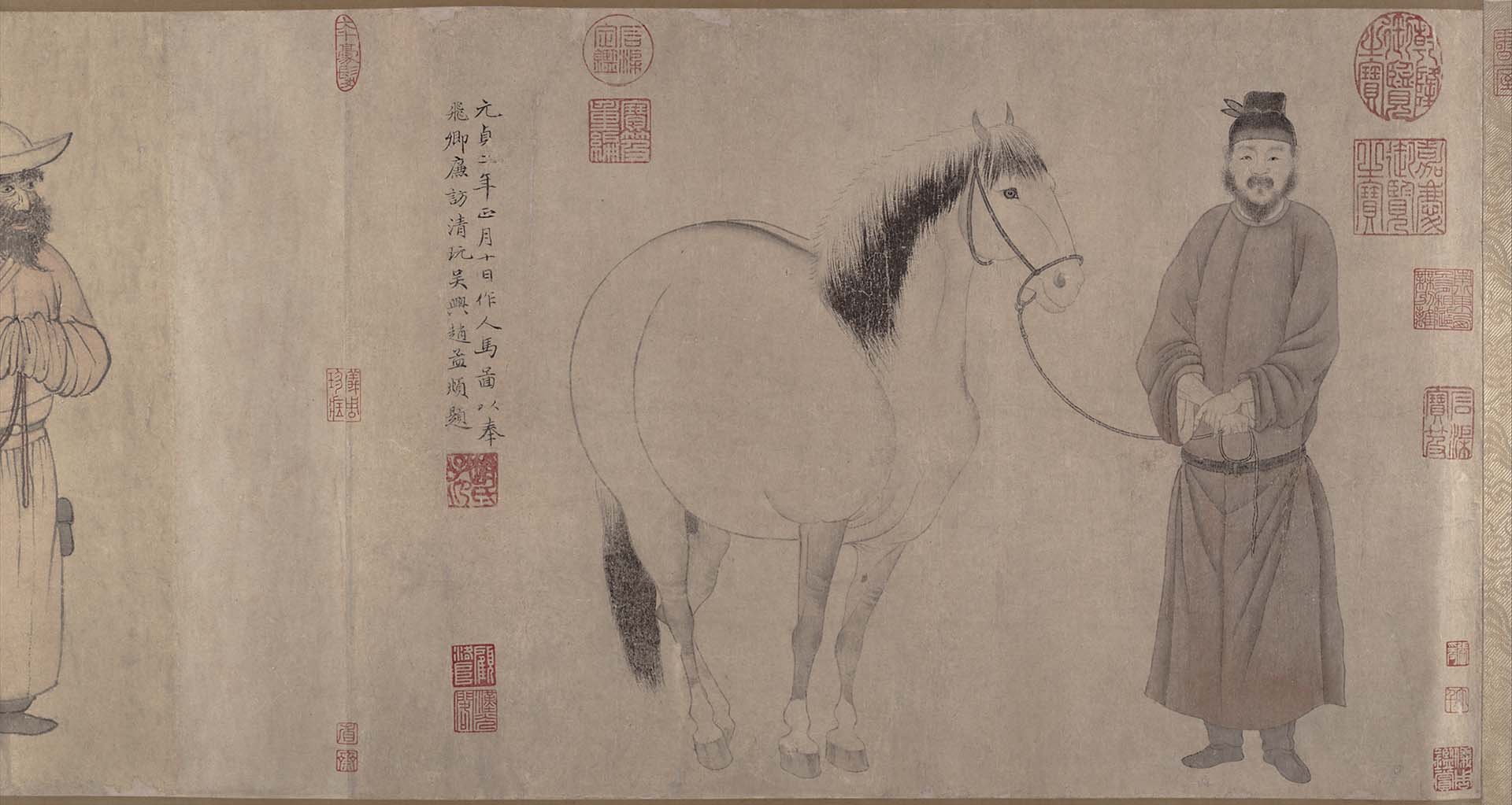 北宋留下的「詩畫」傳統,由金代的文人所吸收並且延續。直至趙孟頫時,他又一次地將文人畫的核心概念拉上檯面討論,將文人畫的筆墨歸結於書法的用筆 。和「詩畫合一」相同的是,書法也是文人的特色、甚至可說是特權,趙孟頫以文人基本功的書法作為文人畫的主軸,意味著人人都可以作畫。有趣的是,趙孟頫與其子也繪製了〈三世人馬圖〉,其中可見與李公麟〈五馬圖〉中牽馬的奚官所戴的特殊帽子。趙孟頫身為趙宋後裔,即使在元代為官,卻屬於當時最不被重視的一群 。他曾任職濟南任行政職,隨後又待業在家。正是這段不到半年的時間,他先後創作了〈鵲華秋色圖〉與〈三世人馬圖〉,將書法融入畫作中,作為南方漢人發聲的武器。文人作畫,似乎意不在畫。人馬圖作為人物畫中母題之一,至李公麟時成為了文人投射自身懷才不遇的載體。黃庭堅的後跋成為有力佐證,圖與文和延伸至詩畫合一,是文人優勢與畫作的第一次結合。元代趙孟頫時的文人困境在於文人身分不被重視,他以另一種方式呈現文人優勢,將書法線條入畫繪成〈鵲華秋色圖〉,展現了獨特的藝術風格及文人畫的精神。晚於〈鵲華秋色圖〉約半年的〈三世人馬圖〉的創作,似乎又回到了文人們急需解答的內在提問:千里馬在此,誰是伯樂?(文/李思潔)