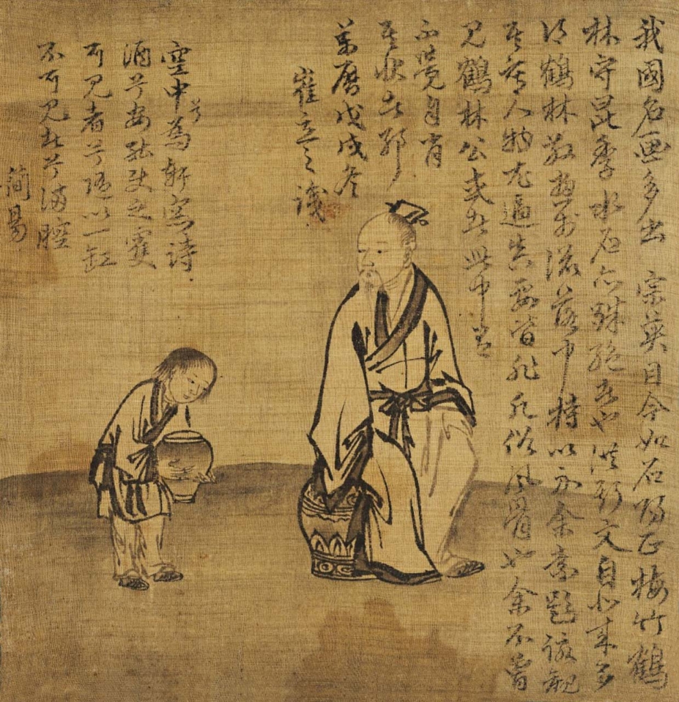 韓國浙派大行其道,可舉李慶胤(1545-1611)所作《山水人物畫冊》說明其畫風,如簡單的構圖、僅由幾何形堆疊而成弱化的山水元素。(註7)第一開(圖6)的畫面中,有一文人坐在瓷鼓凳上,僮僕送上大酒甕,空白處有崔立(1539-1612)於1598年寫下的序言與絕句。如同冊頁第二開〈商山四皓〉所示,崔立詩句「偉然而皓者兮,乍同而乍異,吾方諦視其三人兮,俄若與之為四」更深入地表述畫家心意。雖然李慶胤的畫中只有三人而非四人,崔立還是將畫題訂作「商山四皓」,並說明當觀者本人加入他們之後,便成完整的一組四人。