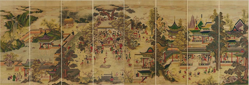 〈郭汾陽行樂圖〉(圖16)屏風上描繪的是唐代大將軍郭子儀在居所舉辦盛宴。郭子儀是唐玄宗時期成功平定安氏之亂的忠心功臣,他更廣為人知的是「三福俱全之人」,富貴、長壽、多子多孫。畫中春光明媚,宮殿式的建築矗立在偌大的園林中,豪華壯麗。畫面橫跨整組屏風,熙熙攘攘,妻妾兒女成群,還有奴僕、歌舞妓等。有異於同時期的中國宮廷繪畫,朝鮮宮廷繪畫並不在意真實立體感的表現,他們甚少使用明暗光影等畫法。唯有在部分建築結構,如屋瓦、樑柱等,可見到些微陰影效果。(註9)