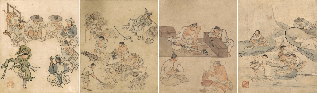 圖11 18世紀 金弘道《檀園風俗圖冊》,左起〈舞童〉、〈打稻〉、〈漂母〉、〈切菸絲〉,紙本設色,39.7×26.7公分,韓國國立中央博物館藏。(圖/徐胤晶)