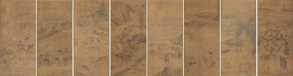 同樣是金弘道所作〈行旅風俗圖〉屏風(圖12),畫上有姜世晃1778年的跋文。在第一面屏風上,有一高官乘轎,眾侍衛簇擁,途中有兩個年輕男子當街下跪向地方官陳情。轎夫的前面有一低階官員,頭戴寬沿帽,正準備提筆記錄。姜氏的跋文「供給之人,各執其物,後先於肩輿前,太守行色,甚不草草。村民來訴,刑吏題牒,乘醉呼寫,能無誤決?豹菴評。」解釋了這個場景:那個小官在替兩人寫訴狀,轎上的官員卻酩酊大醉,令人懷疑他是否能做出公正的判決。屏風上大部分的圖像與上文提及的冊頁有所重疊。舉例而言,屏風上打稻場景中,左方拿著掃帚的男子在《檀園風俗圖冊》中也有;還有騎在馬上以摺扇遮著臉的男子同樣也出現在冊頁中;打鐵鋪的場景也是如此。相比之下,屏風的構圖、人物活動較複雜,襯著山水背景,筆法細緻、設色淡雅。然而,也因此少了天真率性之趣,人物也不再無憂無慮。