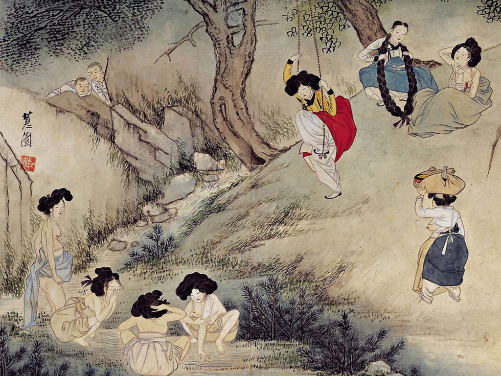 金弘道筆下是普羅升斗小民的日常生活,申潤福的畫作則是描繪新富階級與妓女間的浪漫情景。透過精心安排的背景與道具,申氏成功營造出銷魂氛圍。他以明豔的色調、協調的圖式、高雅的線條打造出獨樹一格的風俗畫。申潤福的風格被公認為風情萬種,這種情調明確展現在《風俗圖畫冊》中〈端午風情〉(圖13)一頁。時為端午節五月初五,女人們在溪流中沐浴,兩個少年躲在岩石後偷窺半裸的女人。他們偷窺的視線增添畫面中的漫漫情慾。頂著高聳假髻的年輕女人們袒胸露腿、沖澡姿態妖嬈,賣弄性感風情。(註8)