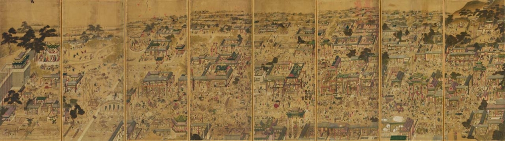 〈太平城市圖〉(圖17)是19世紀早期的宮廷作品,將朝鮮晚期都城漢陽的城市實景與想像中的太平繁華盛世融於一體。屏風共有八面,呈現天下太平,繁華大城中多姿多彩的城市生活與商業活動。畫面中對市集與小販的精細描繪,顯示當時開始對商業活動產生興趣,持正向態度看待。有各流販夫走卒,如雜耍者、小販、街頭賣藝者、沽酒者、商人販賣穀物、舊物、飾物、織品、古董、繪畫等。還有五花八門的店舖,販售絲綢、棉麻、皮革、魚鮮、紙張、扇子、書、花盆、肉品、家具、中國古董等等。(註10)