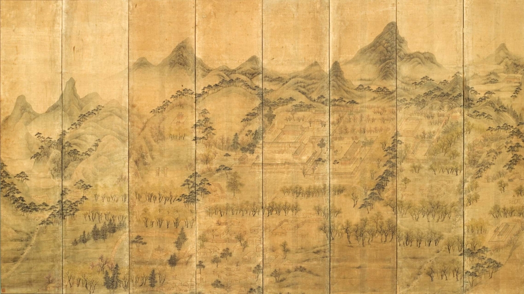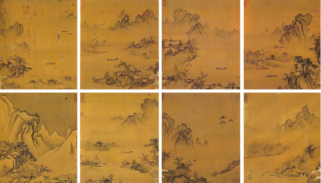 在朝鮮初期,起源於中國以描繪理想境地為主的山水畫日漸受到歡迎。當時的朝鮮人,將源自中國像是「瀟湘八景」一類的山水畫,視為他們心中烏托邦的表現,即使他們從未實際見過瀟湘八景中描繪的景象。自宋代以來,應瀟湘八景這個地景產生了瀟湘八景詩與瀟湘八景圖,此主題在高麗時代(918-1392)後期就流傳至韓國,而在朝鮮時代初期廣為流行。歸於安堅(An Kyŏn,約1447)所作,或是安堅派風格的《瀟湘八景圖》(圖1)就是其中一個著名的例子。這件作品在當時的製作靈感是源自中國「瀟湘八景」的母題,但在此作完成後,在韓國開始影響了其他以八景為格套的作品,《四時八景圖》(圖2)就是在這個脈絡下的一個例子。《四時八景圖〉表現的八景雖然難以明辨其實際的地點,但由構圖、視點與主要的母題表現手法來看,可一再發現其與《瀟湘八景圖》有著相似的表現手法。乍看之下,《四時八景圖》每幅所描繪的石塊、叢樹與山脈所構成的畫面不太協調,但是當八幅組合在一起時,畫面則創造出一個平衡的結構。這樣的母題在朝鮮時代早期為許多文人及官員所愛,並同樣受到熟悉中國經典的日本僧侶所好,而在室町時代,日本僧侶在中國與韓國文化交流的管道中辦演著先驅的角色。