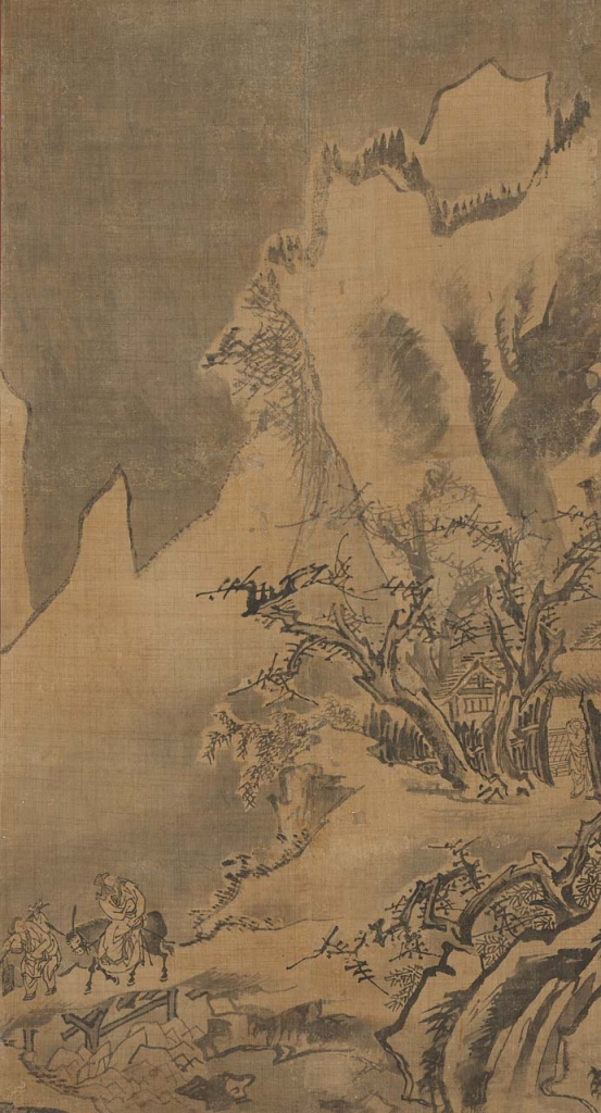 在此時期,引領朝鮮藝術界的另一個值得注意的現象是,浙派的風格傳播到了韓國半島。有一些例子可以說明從15到17世紀間,浙派畫家像是戴進(1388-1462)和吳偉(1459-1508)等,在形塑朝鮮的浙派風格時,扮演了重要的角色。例如,安堅的〈赤壁圖〉(圖5)是現存最早朝鮮畫家受到戴進風格影響的作品(圖6)。(註3)這幅作品中,以不平衡的構圖與堆疊的山體表現了戲劇性的場景,由此可見畫家熟稔於浙派的繪畫技法。另一位韓國畫家金明國(約1600—1662後)的作品則展現了韓國發展浙派風格的晚期風貌。金明國〈雪中歸驢圖〉(圖7)中利用狂放、快速的筆法可以知道其深受浙派狂態邪學代表畫家之一的吳偉所影響。