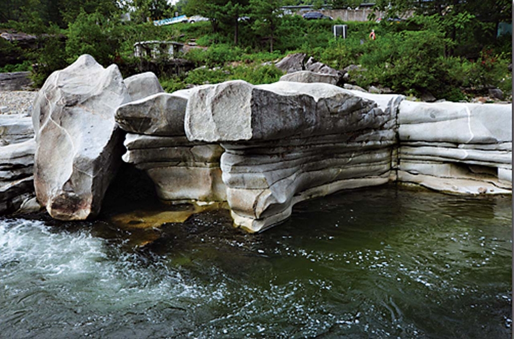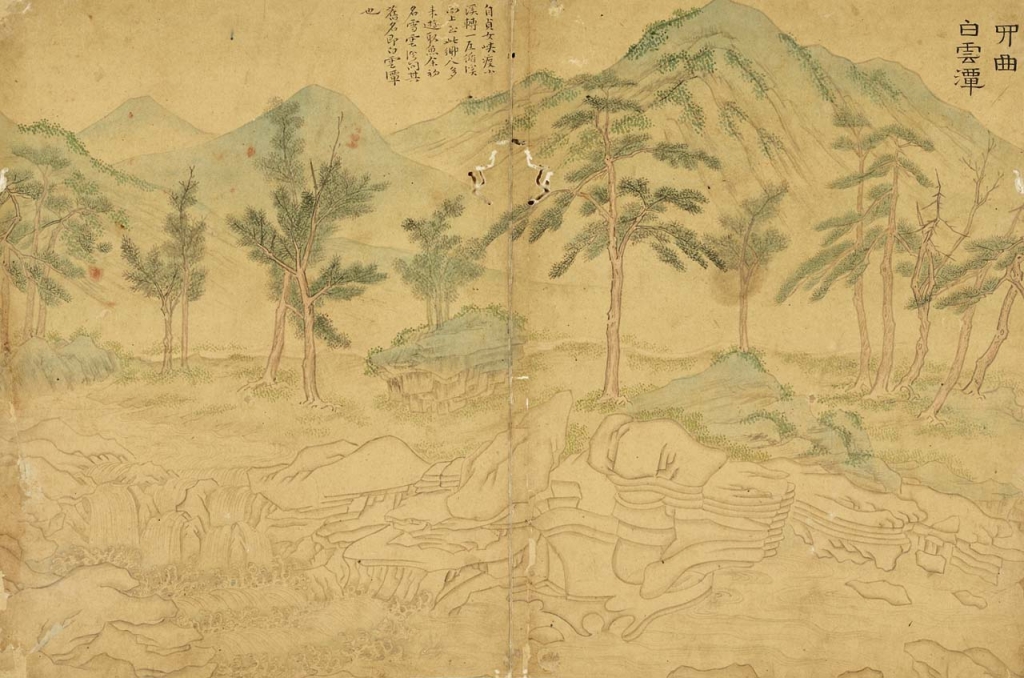 「武夷九曲」這個母題在朝鮮時期持續發酵,其內容與形式逐漸被朝鮮文人改寫成符合他們的生活形貌。例如,當退休或是為了隱居而建造第二居所時,他們時常將在附近的溪流命名為九曲溪。像是金壽增(1624-1701)和宋思烈(1607-1689)就是上述情況的例子,而他們二人大概也是這個新趨勢的開端。金壽增先後擔任過各種政府要職,當他卸下政務時,便在江原道建造了他的別墅。江原道是在首爾之外的著名郊山,金壽增以他的號「谷雲」,再加上九曲溪的意象,將此地命名為「谷雲九曲」(圖10)。1682年,金壽增與家人、同事及其追隨者於此聚會,並邀請著名的畫家曹世杰(1635-1705)繪製一件名為《谷雲九曲圖》的作品(圖11)。金壽增建立隱居之所,舉行雅集的行徑,引起了同時期畫家的共鳴,也影響了後世的文人。另一位文人宋思烈也改寫「武夷九曲」的內容,進而創造了屬於他自己的版本,名為「華陽九曲」。宋思烈的「華陽九曲」不僅是作為他的隱居之所,其後世弟子們利用此地紀念宋思烈,作為他們學術與政治生涯的領袖。由以上「九曲」的案例可知,朝鮮文人是如何將學術與政治中心的確立與地景圖像的資助委託相互連結。